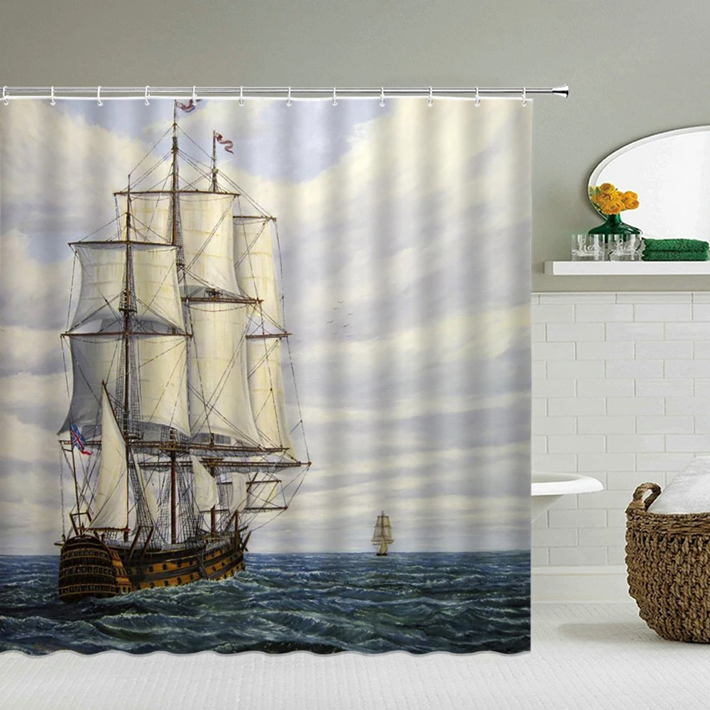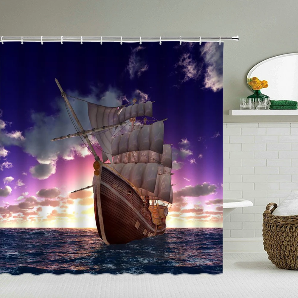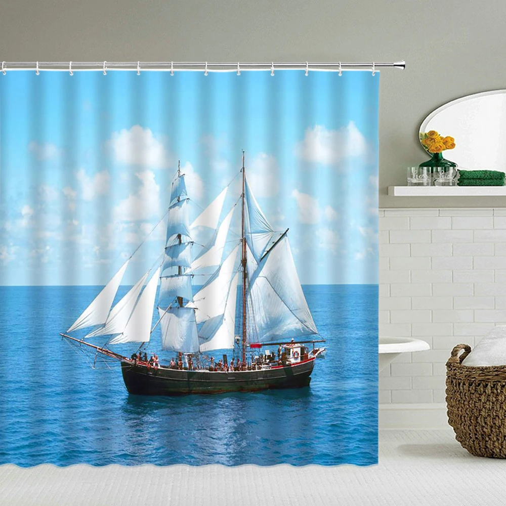 Парусная лодка, водонепроницаемые занавески для душа в ванной, морская навигация, занавески для ванной, 3d печать с крючками, 180*180 см, моющаяся ткань