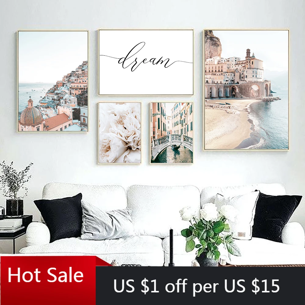 Постер с изображением побережья Италии, цветов, природного ландшафта, морского пляжа, мечты, арт-Картина на холсте, морской пейзаж, Настенный декор, украшение для дома