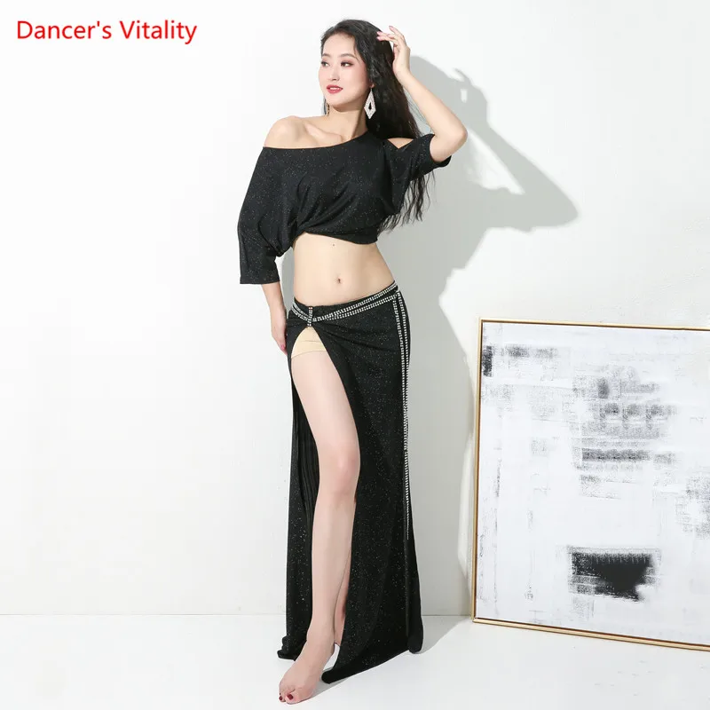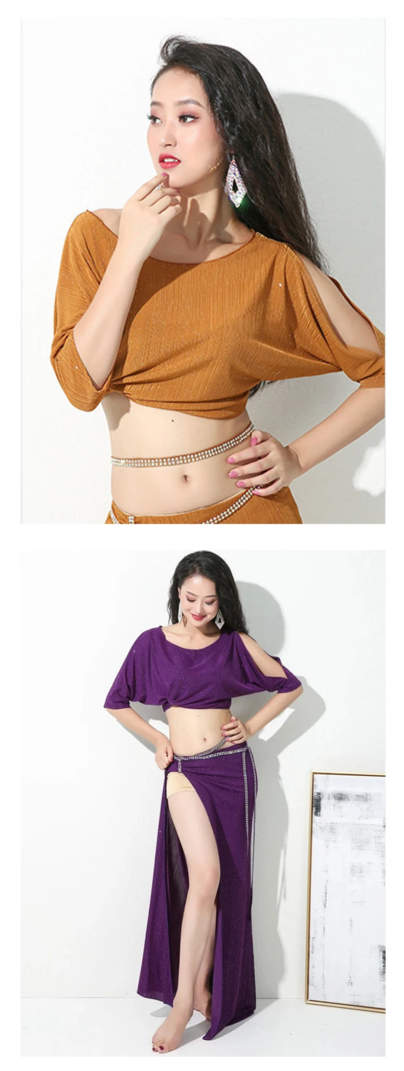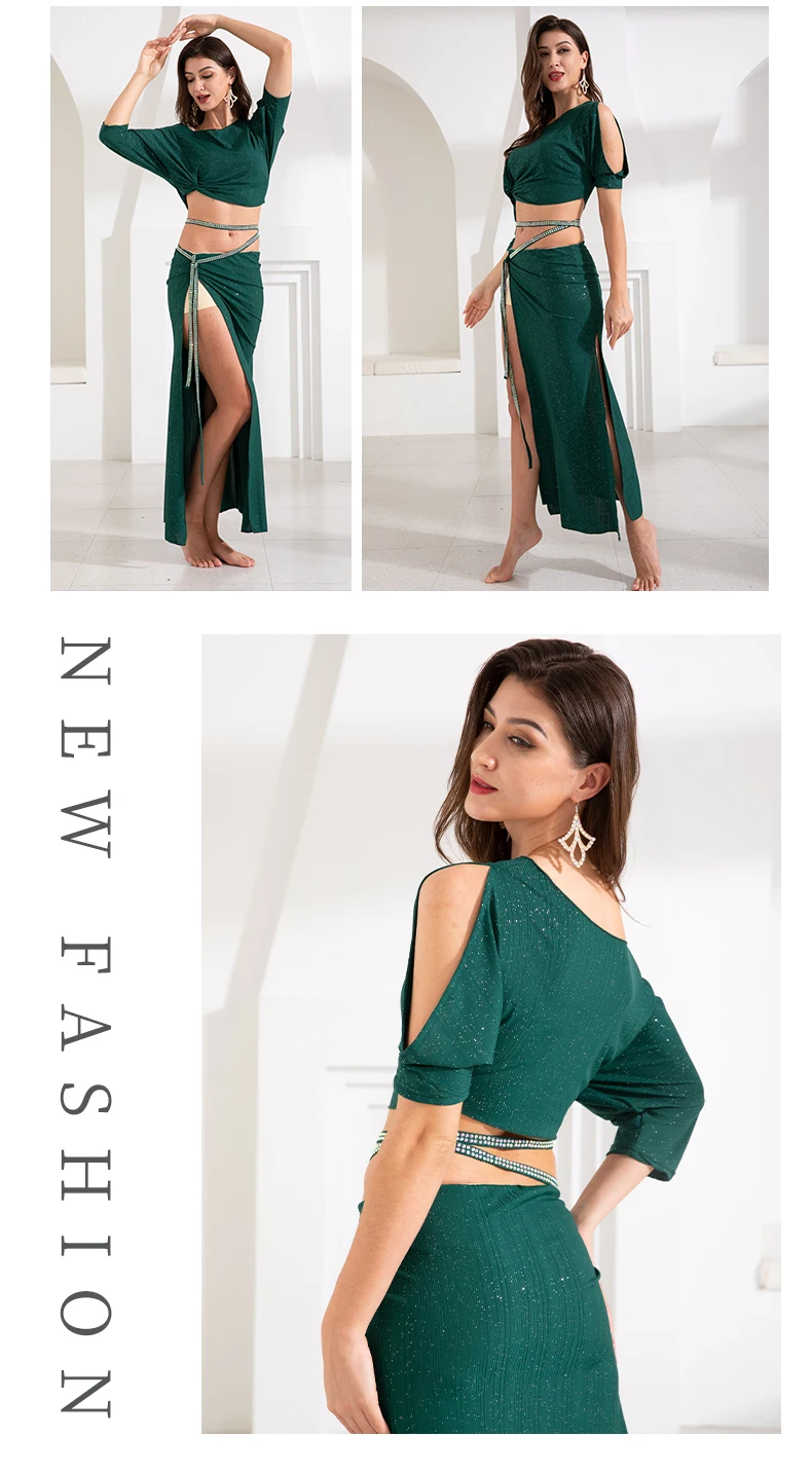 Костюм для танца живота из трех предметов для женщин и взрослых; Элегантный топ с блестками; Одежда для тренировок; Горячая распродажа; Пояс со стразами и длинная юбка; Комплект для выступлений
