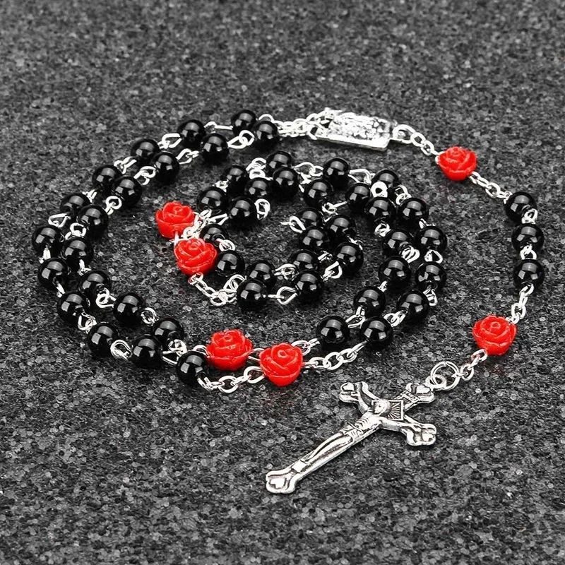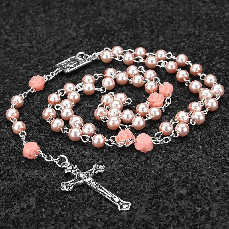 4 цвета имитация жемчуга бусы четки ожерелье падение крест Девы Марии центр четки Иисуса кулон с крест с цветами розы