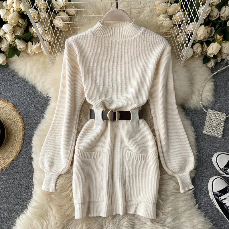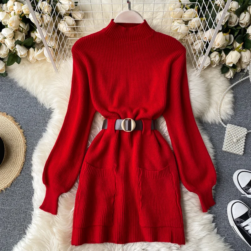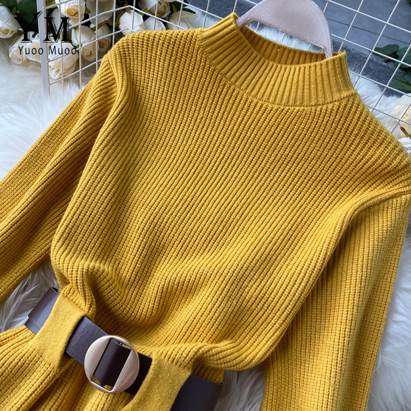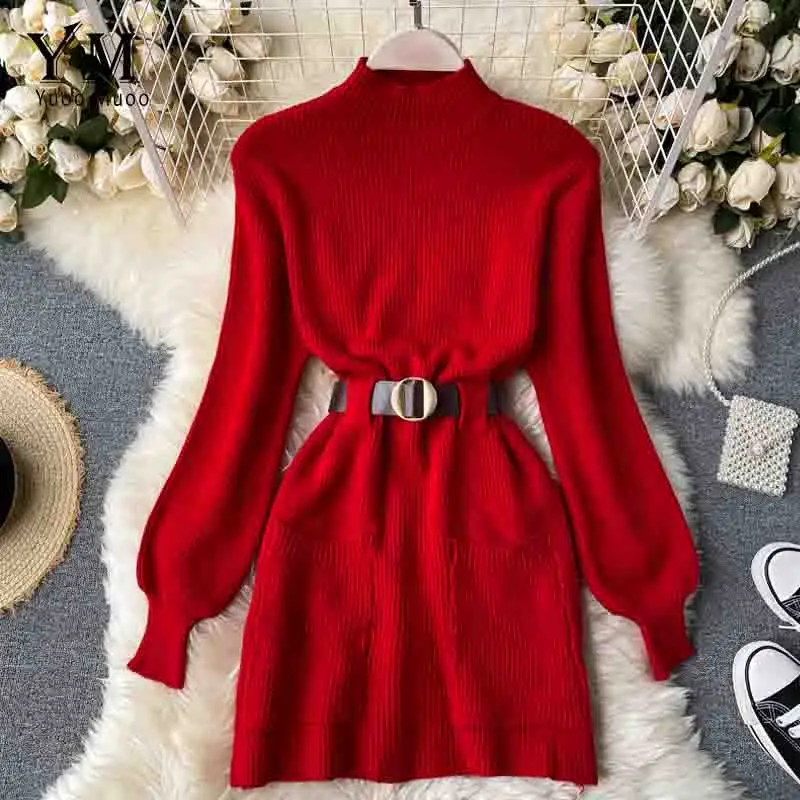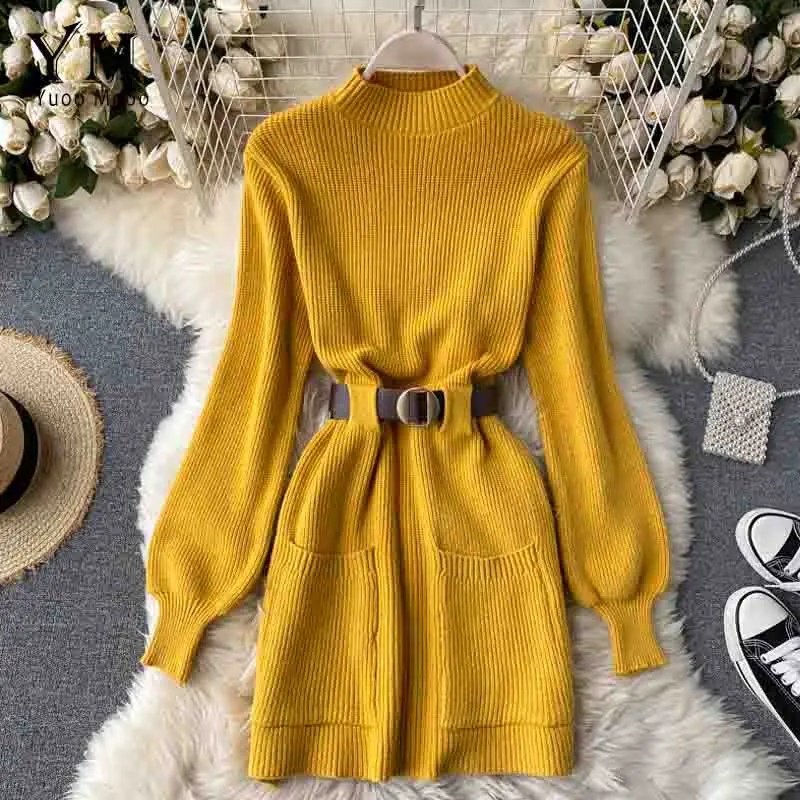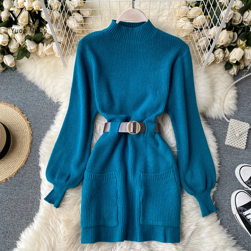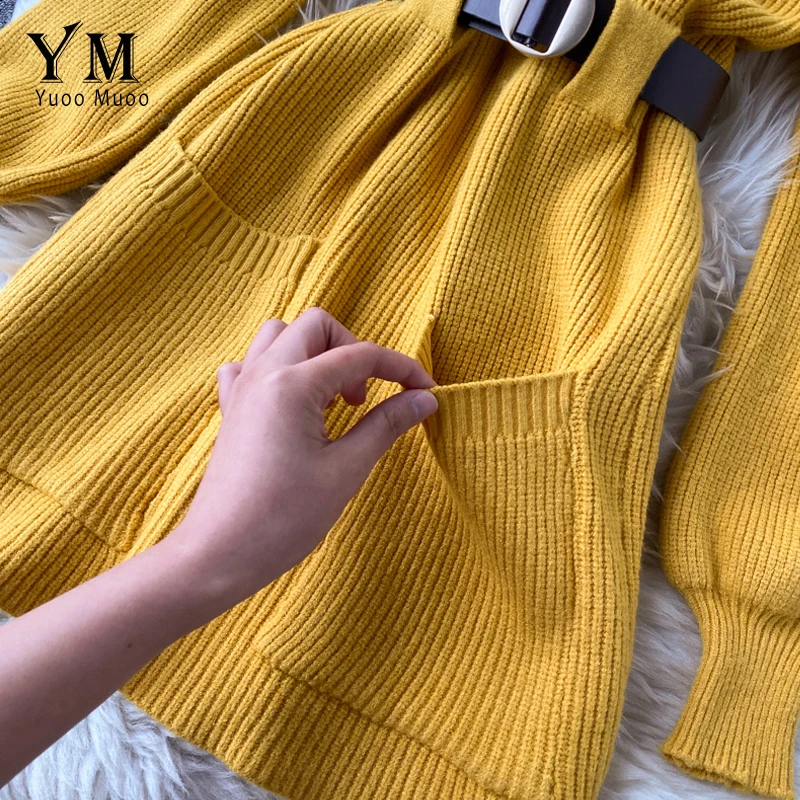 Новинка 2020, осенне-зимнее женское вязаное платье YuooMuoo, дизайнерское платье-свитер с высоким воротником и карманами в Корейском стиле с поясом, повседневное короткое платье