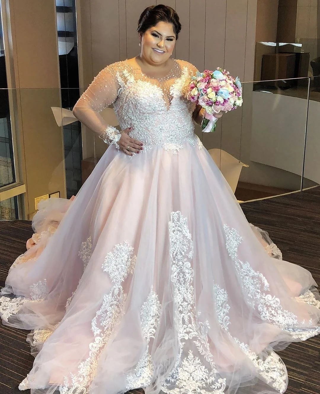 Женское свадебное платье принцессы, розовое кружевное платье с длинным рукавом и аппликацией, а-силуэт с жемчугом, большой размер, со шлейфом