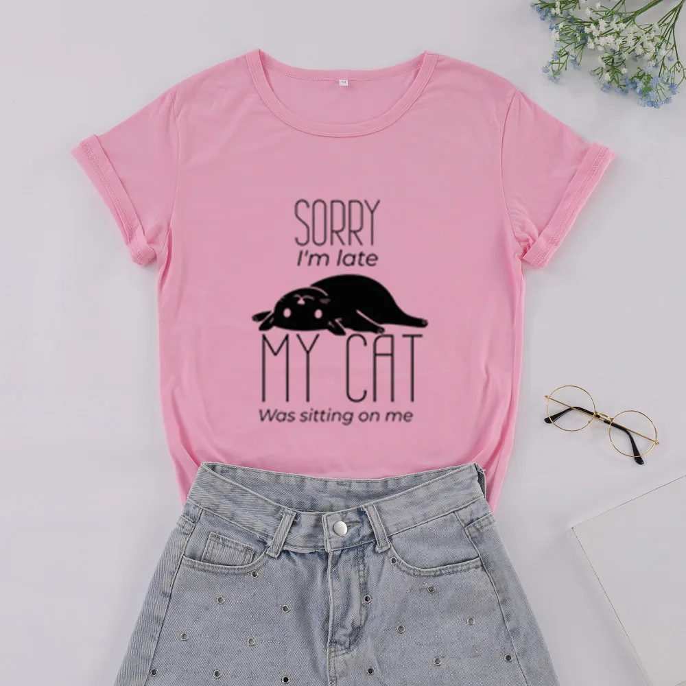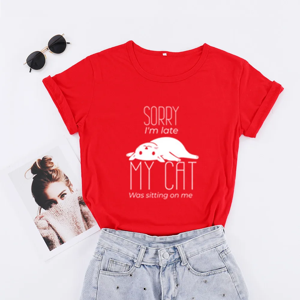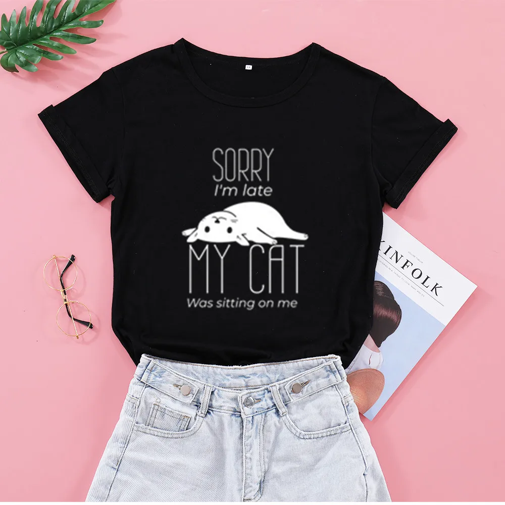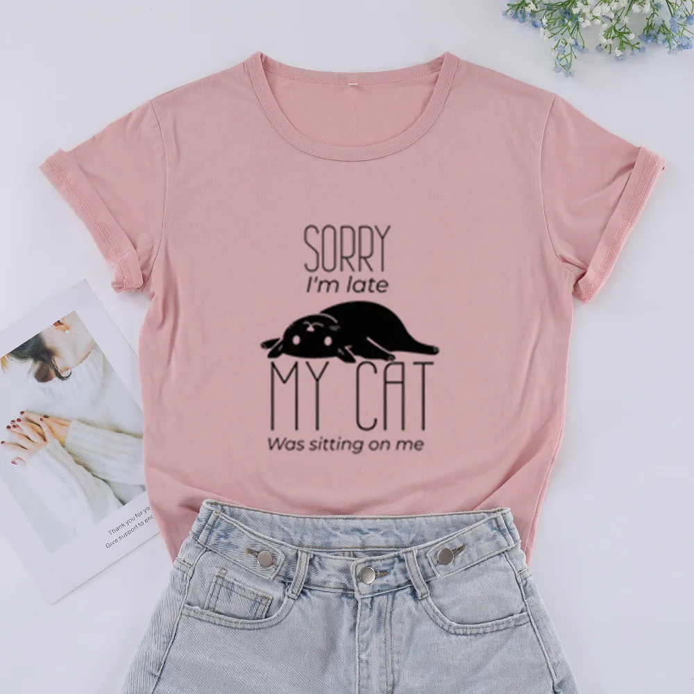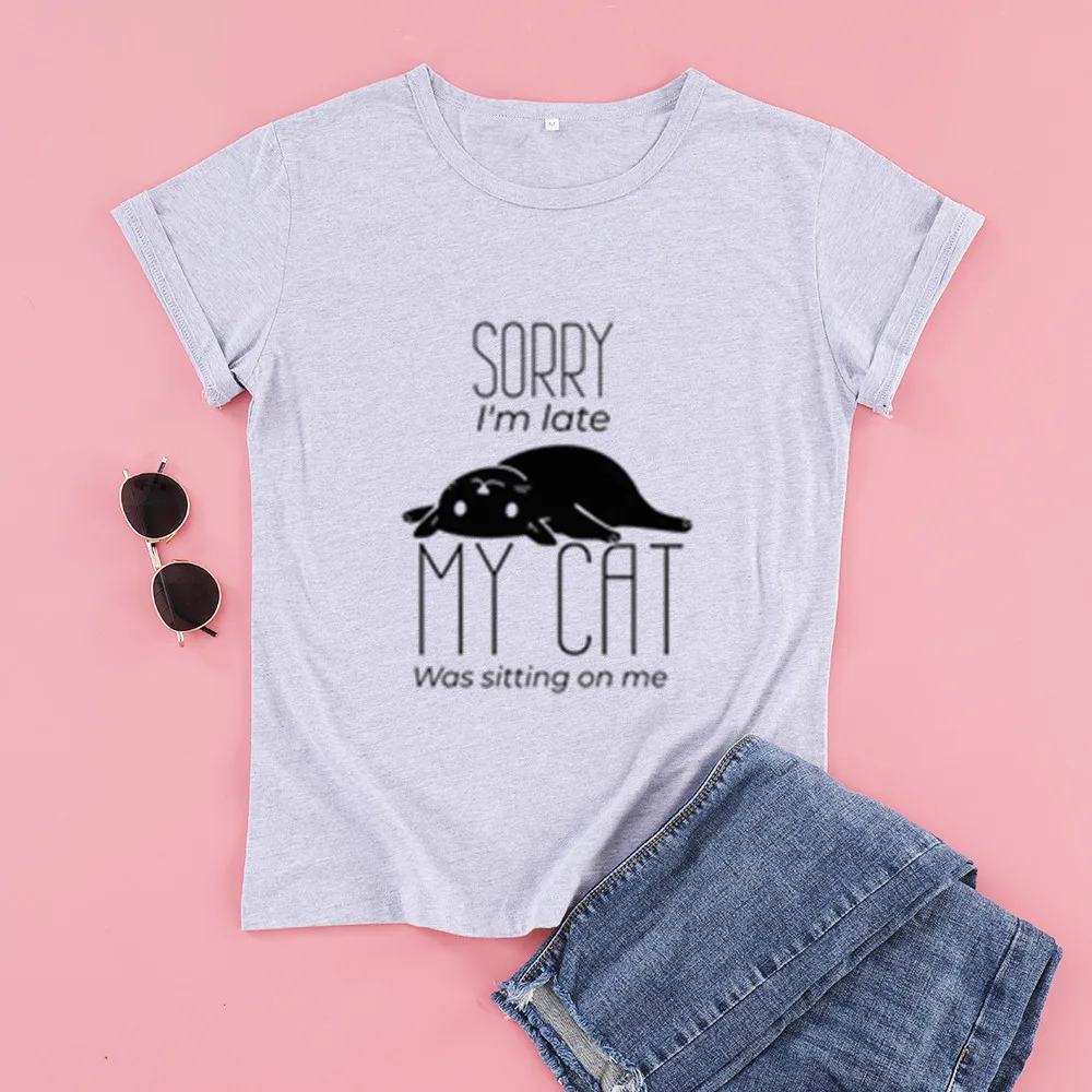 Sorry I'm Late My Cat сидит на мне мама Рубашка креативные буквы 100% хлопок футболки женская футболка с круглым вырезом и коротким рукавом