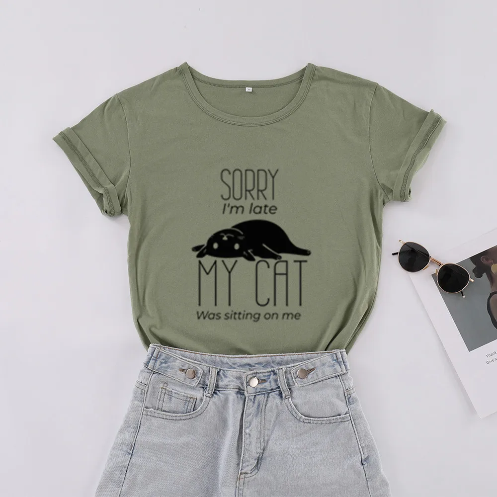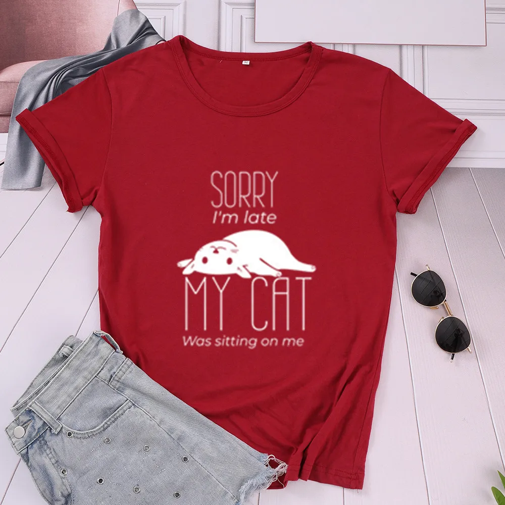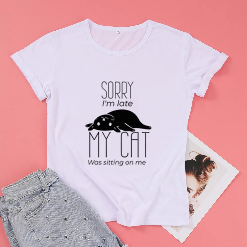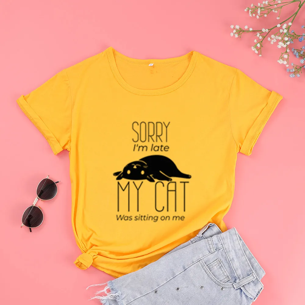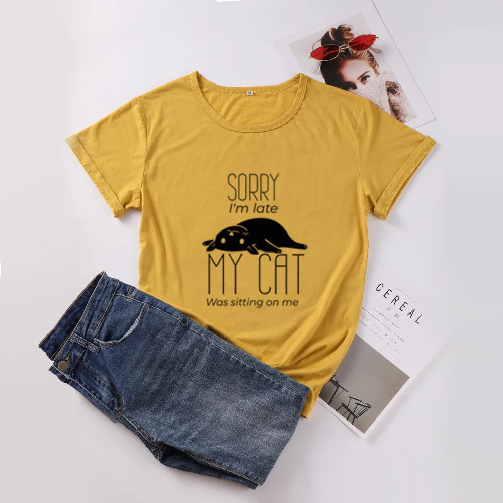 Sorry I'm Late My Cat сидит на мне мама Рубашка креативные буквы 100% хлопок футболки женская футболка с круглым вырезом и коротким рукавом