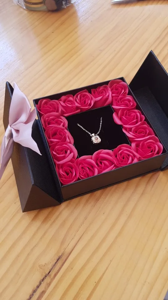 ¡Vino antes de lo que ponía! Estoy encantada con ello. Realmente es precioso; las rosas huelen muy bien, el colgante es precioso (se ve la proyección pero un poco ilegible), una caja preciosa y encima el lazo magnético. Viene una bolsa para meterlo y muy bien embalado. ¡Sin duda una buena inversión!