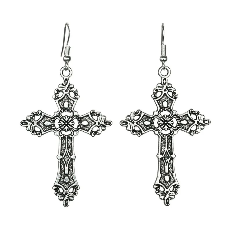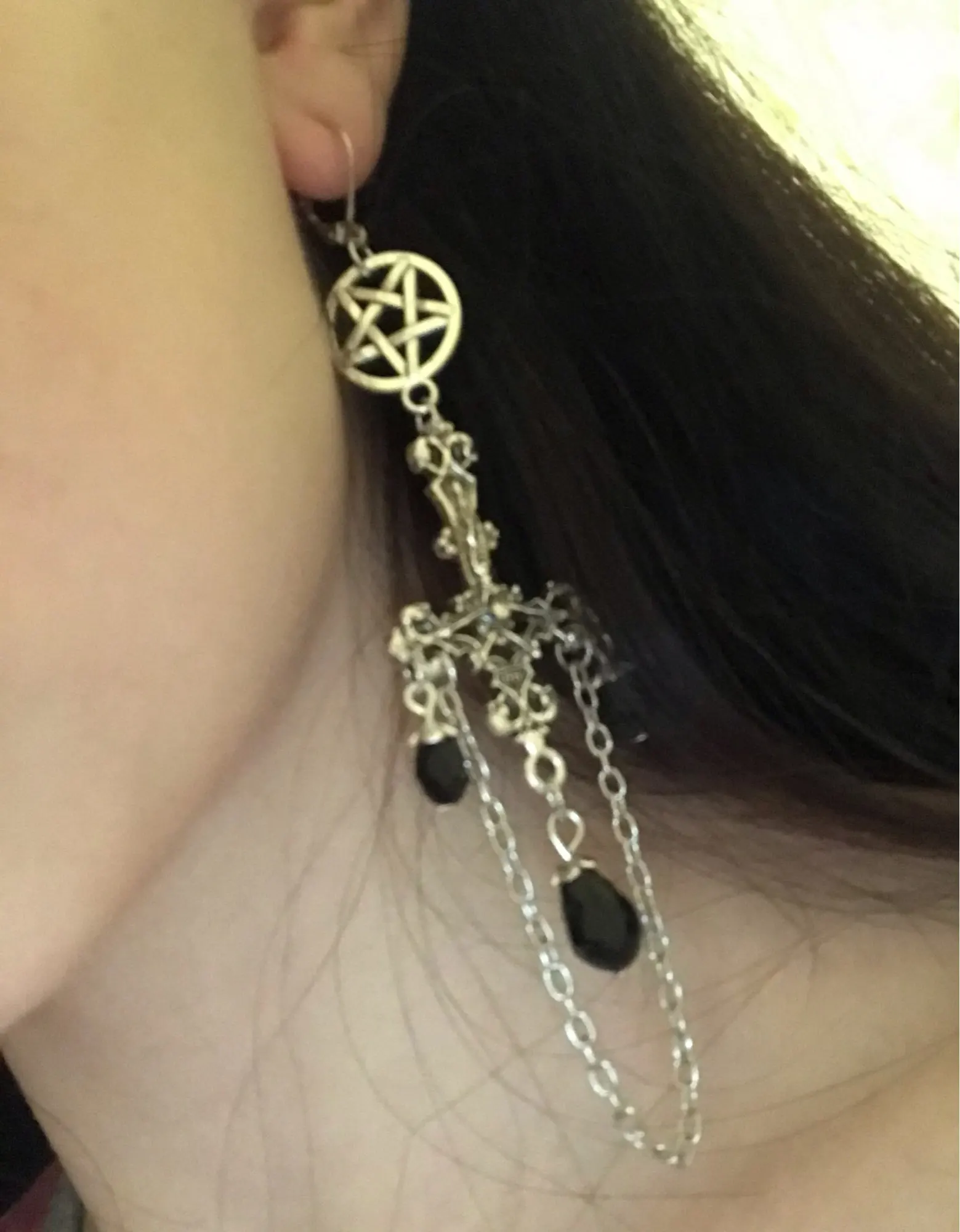 Перевернутые серьги с распятием и черными кристаллами в форме слезы. Классические готические висячие серьги
