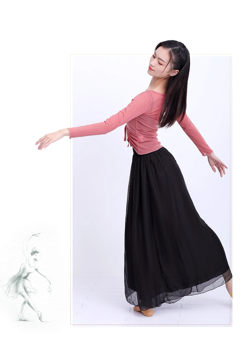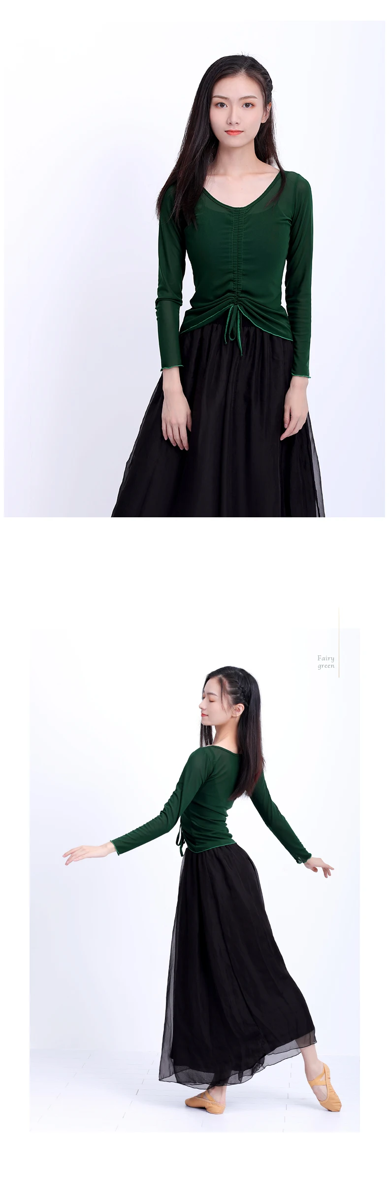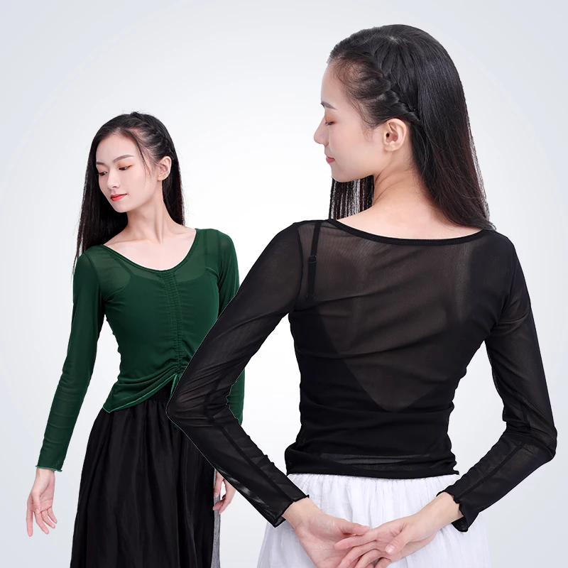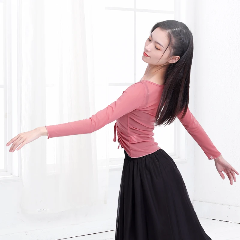 Женский просвечивающий однотонный сетчатый топ, Классическая танцевальная одежда с длинным рукавом, футболка с изображением балета на завязках, Женский танцевальный костюм