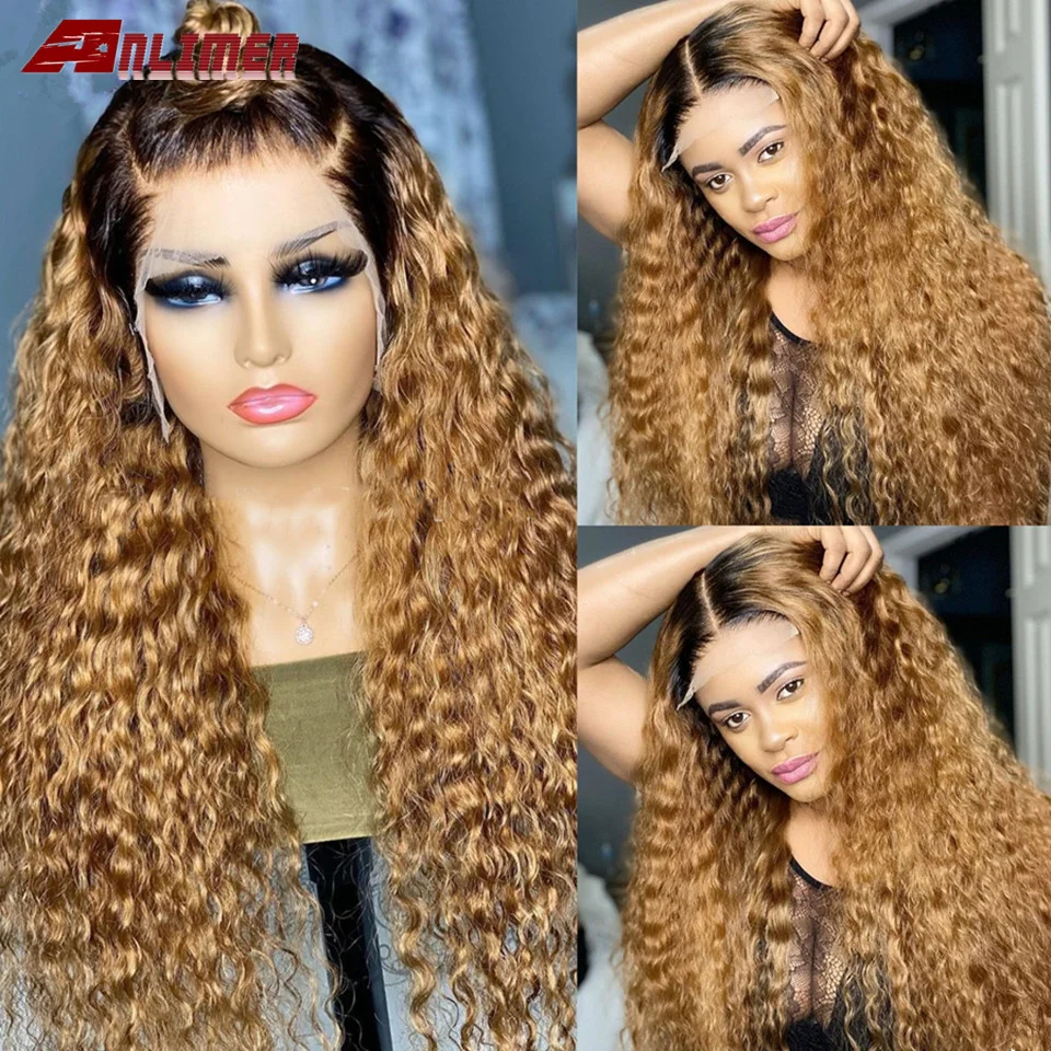 Медовая Блондинка 13x4 кружевные передние парики вьющиеся человеческие волосы парик цветные кружевные парики человеческие волосы предварительно выщипанные V части глубокие волны вьющиеся парики