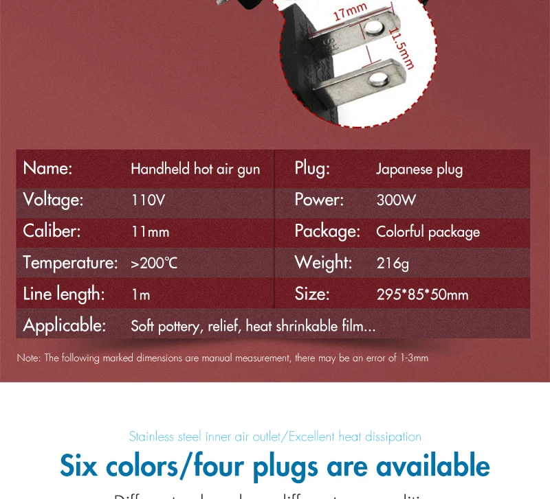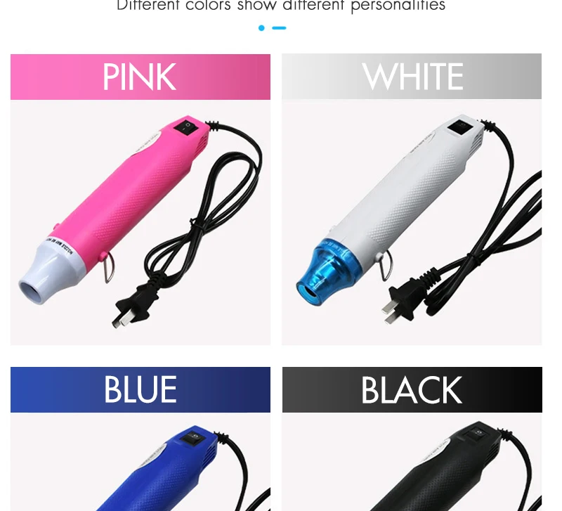 Цвет поставляется случайным образом горячий воздушный пистолет Особенности:-Можно использовать для разогрева порошка и усадочного листа-удерживая 3-5 см расстояние от работы и около 45 градусов угол для нагрева до завершения. -После завершения, используйте тепловой пистолет при высокой температуре, чтобы выдуть несколько минут,-он не только может добавить его твердость, но и его яркость-температура не может регулироваться, по идее, может достигать 200 градусов в течение нескольких секунд-не работать более 10 минут, Дуйте под углом 45 градусов, чтобы избежать отсасывания тепла. -Будьте осторожны при использовании спецификаций: материал: стальной пластик рабочая температура. : Номинальная мощность 200 °C: 300 Вт Номинальное напряжение: 220 В 50-60 Гц Тип вилки: ЕС, Великобритания, США, JPN вилка Примечание: никогда не прикасайтесь к горячей насадке или расплавленному клею для вашей цели. Держите его подальше от детей.