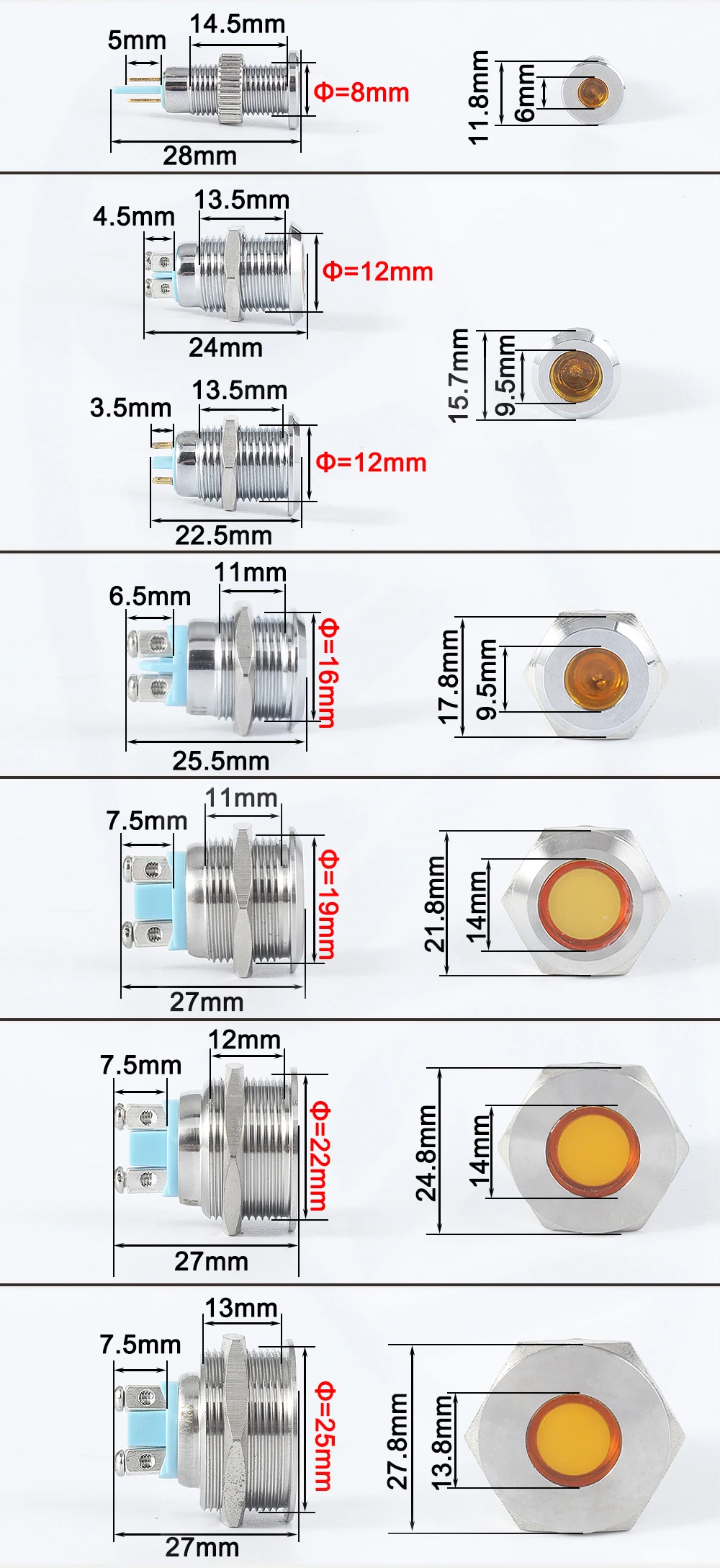 Водонепроницаемая металлическая светодиодная сигнальная лампа, 1 шт., 8 мм, 12 мм, 16 мм, 19 мм, 22 мм, 25 мм, 3 в, 5 В, 6 в, 12 В, 24 В, 110 В, 220 В