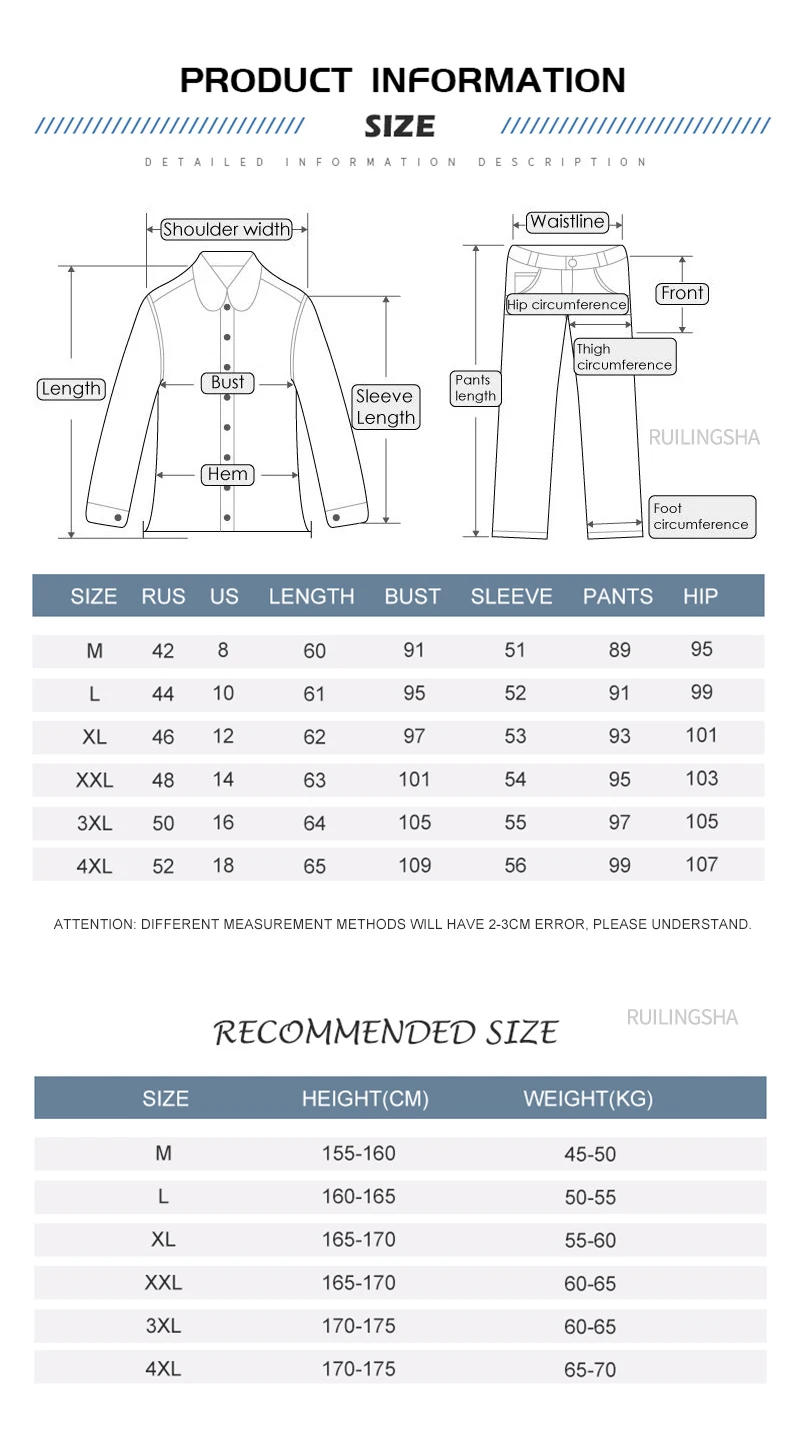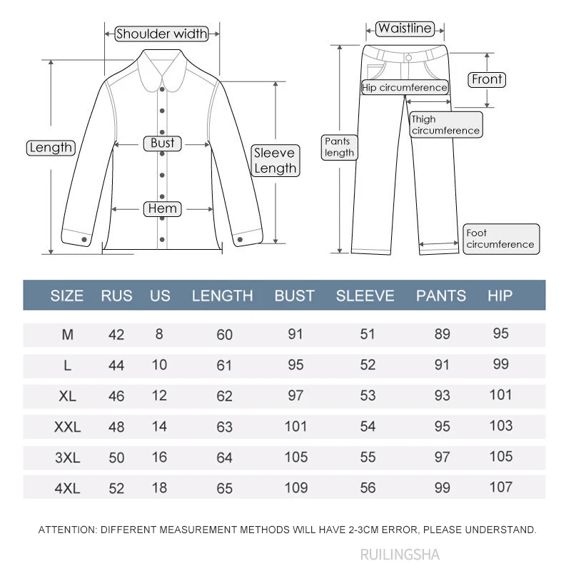 Женский Размер: Размер: M, длина: 60 см, обхват груди: 91 см, рукав: 51 см, брюки: 89 см, обхват бедер: 95 см(Рекомендуемый рост: 155-160 см, вес: 45-50 кг) Размер: L, длина: 61 см, обхват груди: 95 см, рукав: 52 см, брюки: 91 см, обхват бедер: 99 см(Рекомендуемый рост: 160-165 см, вес: 50-55 кг) Размер: XL, длина: 62 см, обхват груди: 97 см, рукав: 53 см, брюки: 93 см, обхват бедер: 101 см(Рекомендуемый рост: 165-170 см, вес: 55-60 кг) Размер: XXL, длина: 63 см, обхват груди: 101 см, рукав: 54 см, брюки: 95 см, обхват бедер: 103 см(Рекомендуемый рост: 165-170 см, вес: 60-65 кг) Размер: XXXL, длина: 64 см, обхват груди: 105 см, рукав: 55 см, брюки: 97 см, обхват бедер: 105 см(Рекомендуемый рост: 170-175 см, вес: 60-65 кг) Размер: 4XL, длина: 65 см, обхват груди: 109 см, рукав: 56 см, брюки: 99 см, обхват бедер: 107 см(Рекомендуемый рост: 170-175 см, вес: 65-70 кг) Из-за способа измерения допускается погрешность в 1-3 см, спасибо.