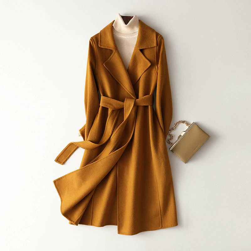Новое поступление, 100% шерстяное пальто, Брендовое зимнее шерстяное пальто, винтажное плотное кашемировое пальто, однотонное Женское пальто, Длинная шерстяная Верхняя одежда с поясом