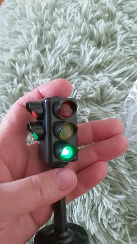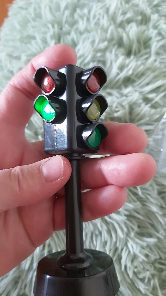 Шел в Пермский край больше 2 месяцев. Огоньки только с двух сторон. Сверху нажимаешь на кнопочку, горит на двойном зеленый , на тройном моргает красный и пикает, потом, как на настоящем светофоре, пикать начинает часто, зеленый гаснет, загорается на тройном желтый, 5 раз мигнет, и на двойном начинает моргать и пикать красный, а на тройном горит зеленый. Вот и весь цикл. После надо снова нажимать кнопку. Ребенок доволен, только жаль, что постоянно тухнет.