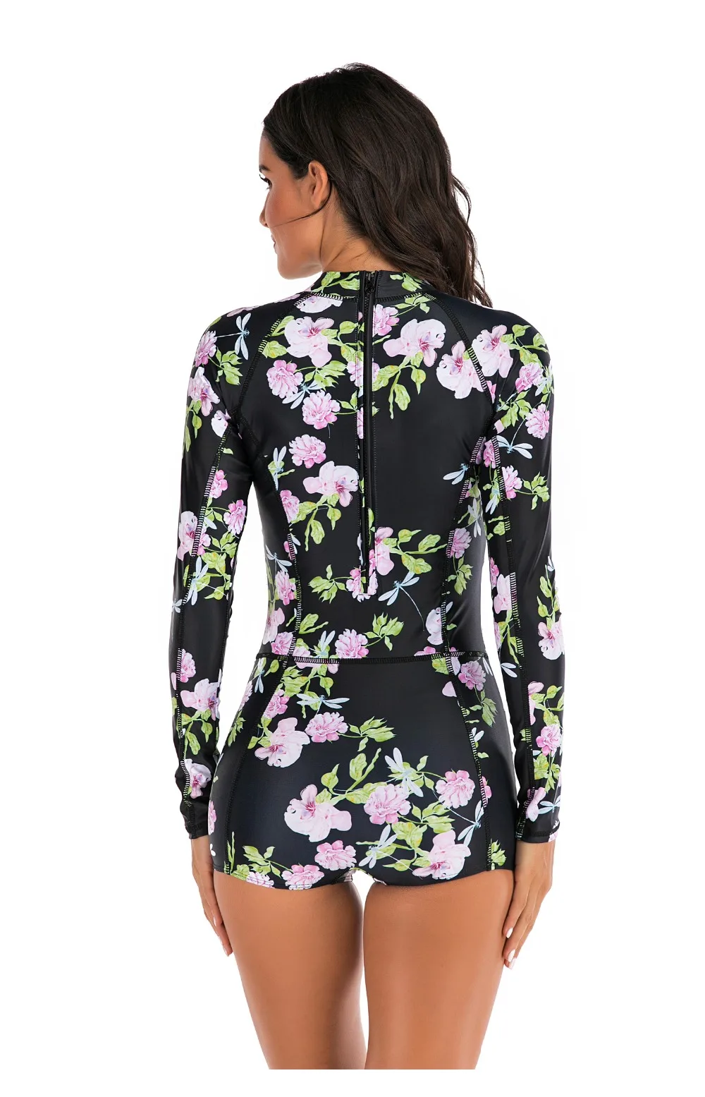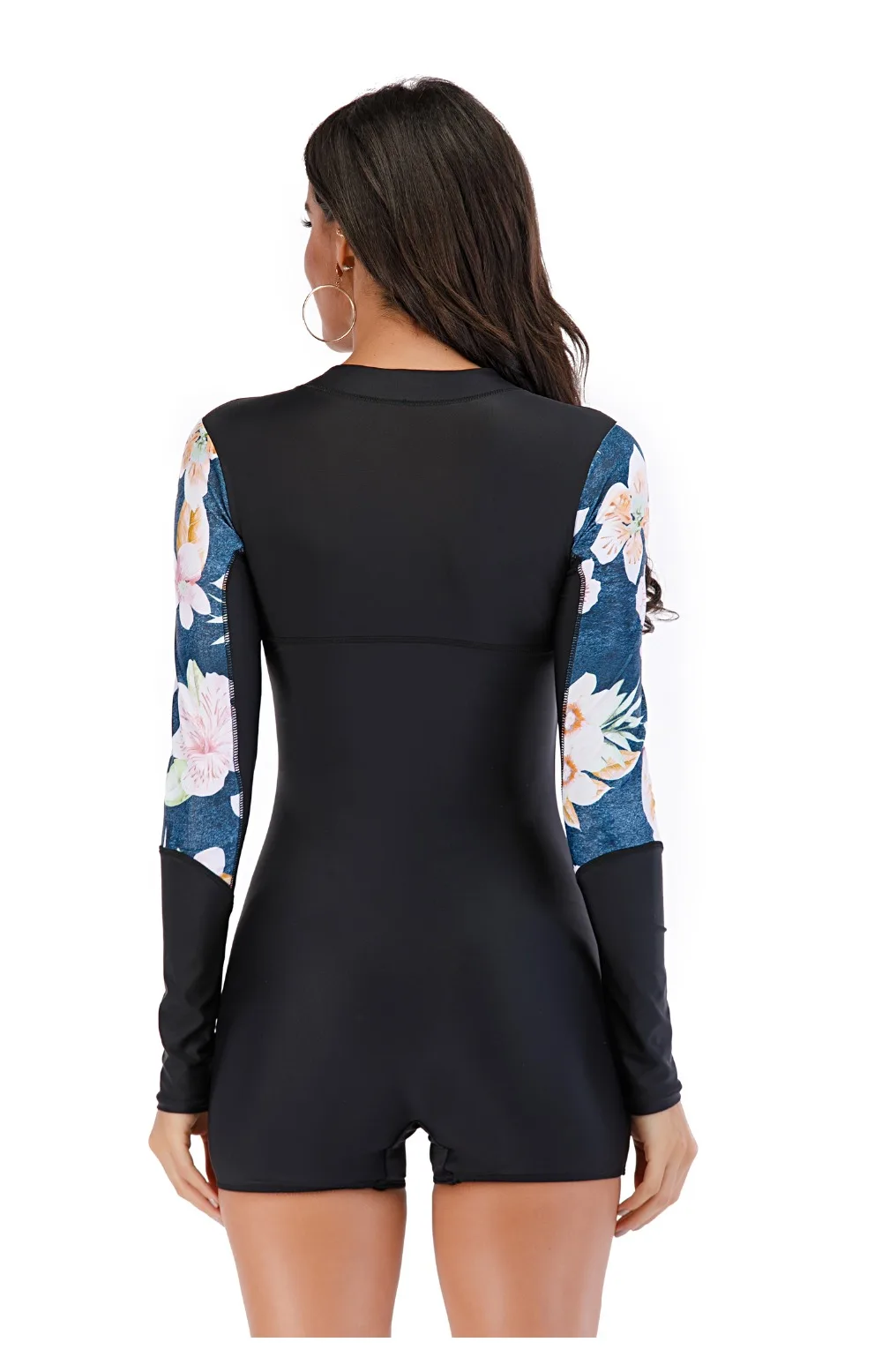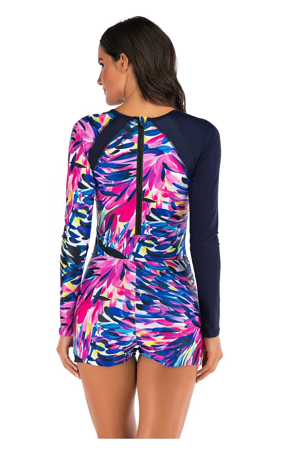 Женский слитный купальник на молнии спереди с коротким рукавом и принтом