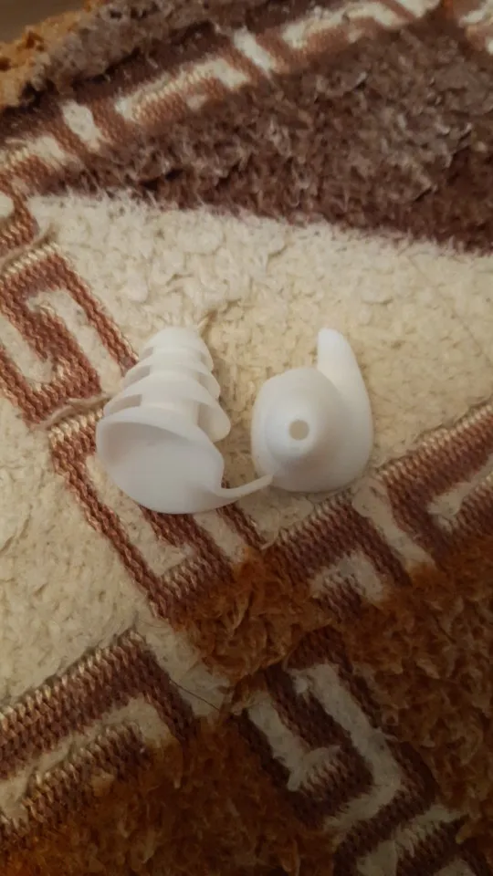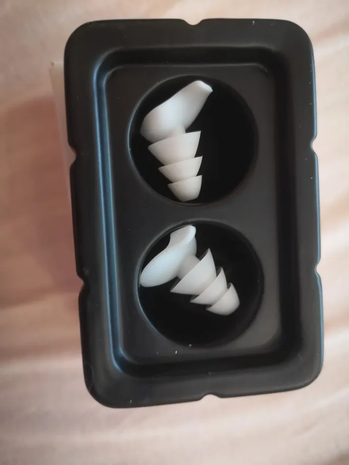 Эти затычки для ушей не удобны и не подходят для длительного ношения. На первом месте они сделаны из мягкого силикона, но их основная часть толстая и не гибкая. После долгого ношения, я чувствую дискомфорт от частей конусной формы, потому что они имеют очень небольшую кривизну и в буквальном порядке копают в кожу. Также их поперечное сечение эллиптически видно на фотографиях.