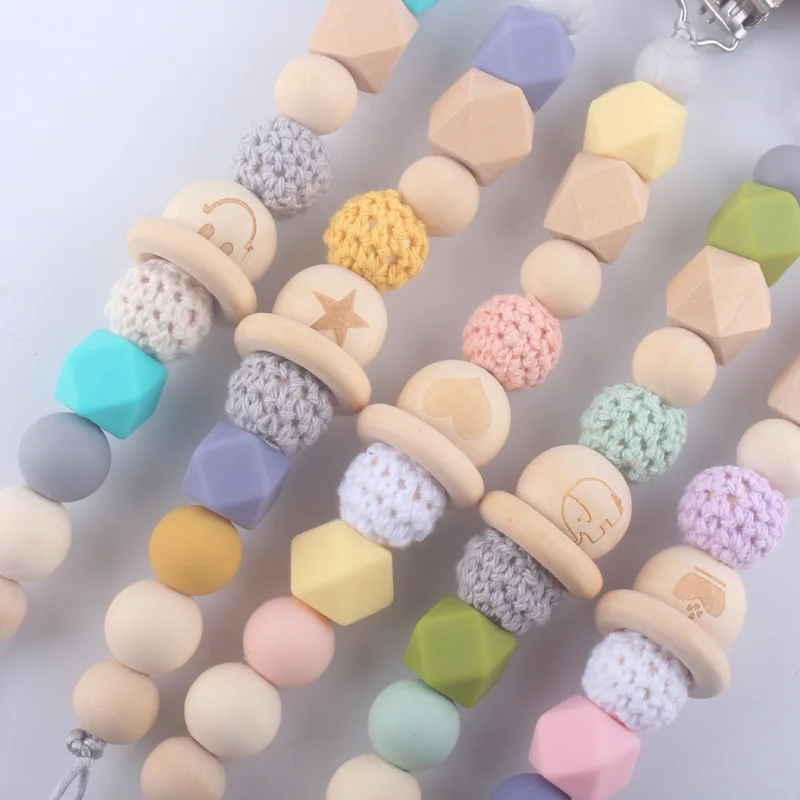Детская цепочка для соски, слон, звезда, цветок, сердце, деревянные зажимы, соска, зажимы, силиконовые деревянные бусины, детское питание