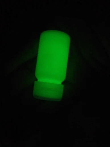 Glow in the dark werkt heel goed, maar het is niet vloeibaar. Ik kan stukjes uit het flesje krabben met een tandenstoker...