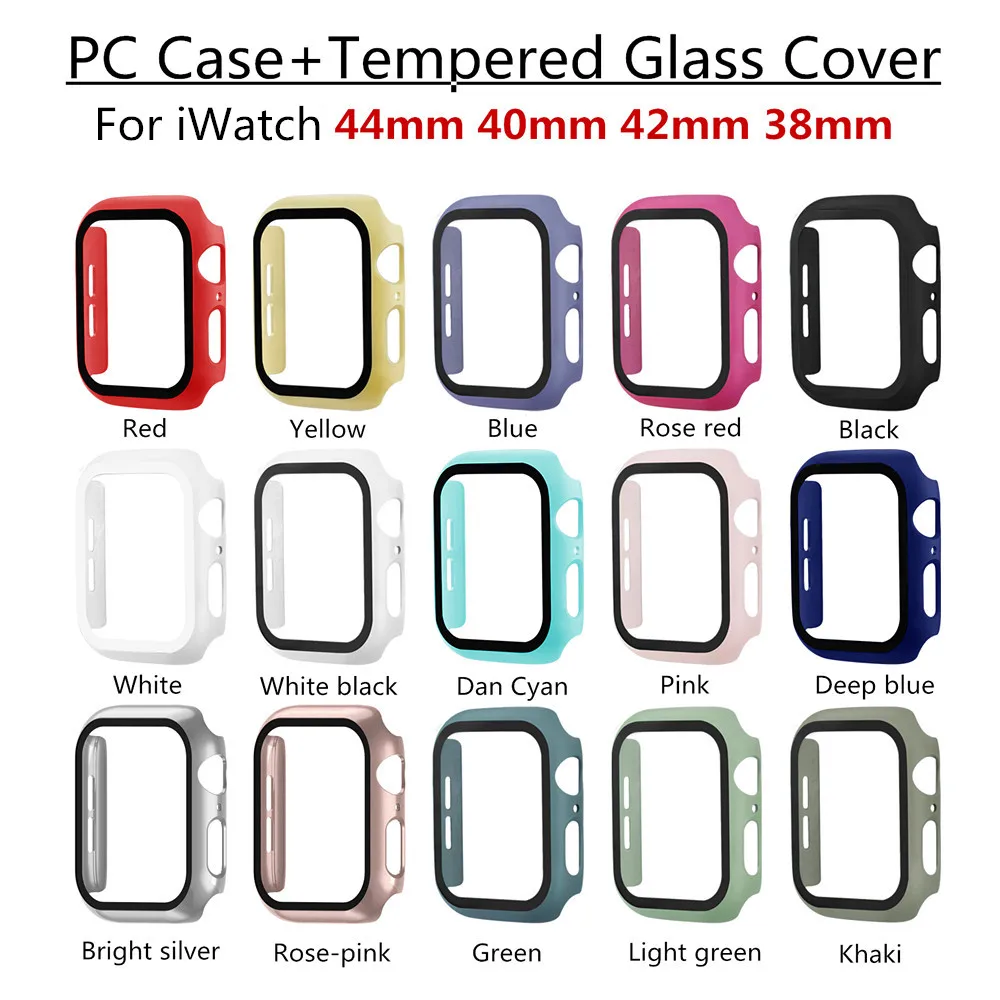 Много цветов, Защитный чехол для Apple Watch серии 6 SE 5 4 3 2 ПК и стеклянная крышка прочный бампер для наручных часов iWatch, 44/40 мм, 38, 42 мм, версия