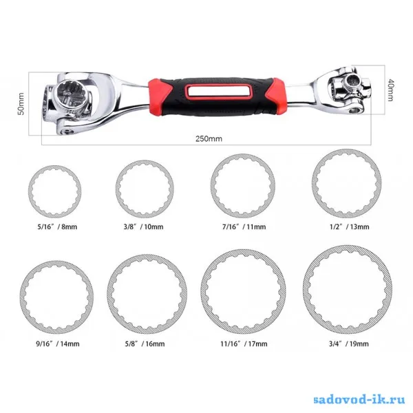 Легким движением руки найдите необходимый Вам размер ключа, вращая набор головок с каждой стороны инструмента. Радиус вращения составляет все 360 градусов. Все размеры указаны с торца определенной насадки - это очень удобно и экономит кучу Вашего времени!
