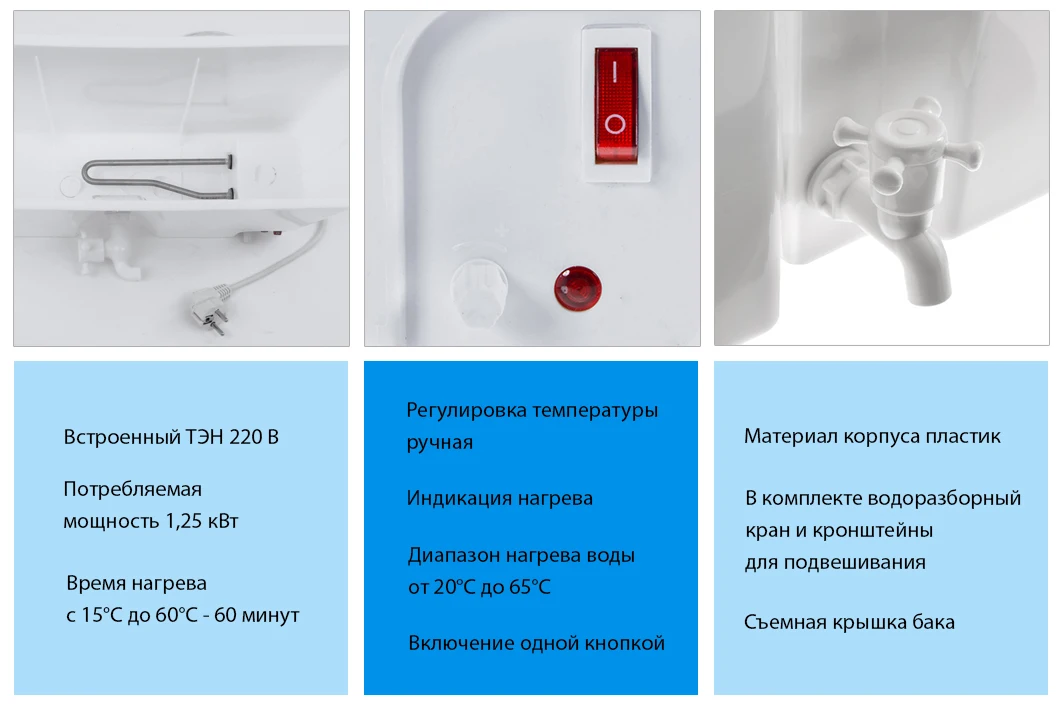 Водонагреватель «Чистюля» наливного типа и не требует подключения к водопроводной сети. Подвесьте водонагреватель на стену с помощью кронштейнов (входят в комплект) или на умывальник «Мойдодыр». Откройте крышку и залейте в ёмкость воду. Воткните вилку водонагревателя в розетку. При подключении к электросети заземление обязательно! Нажмите на кнопку вкл. и с помощью поворотной рукоятки выберите необходимую температуру. Дождитесь, пока вода нагреется до заданной температуры.