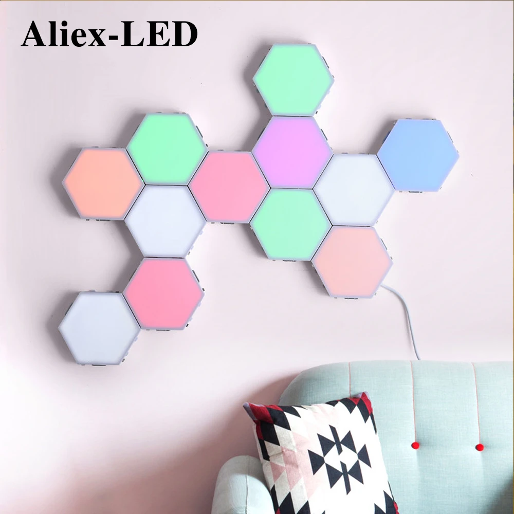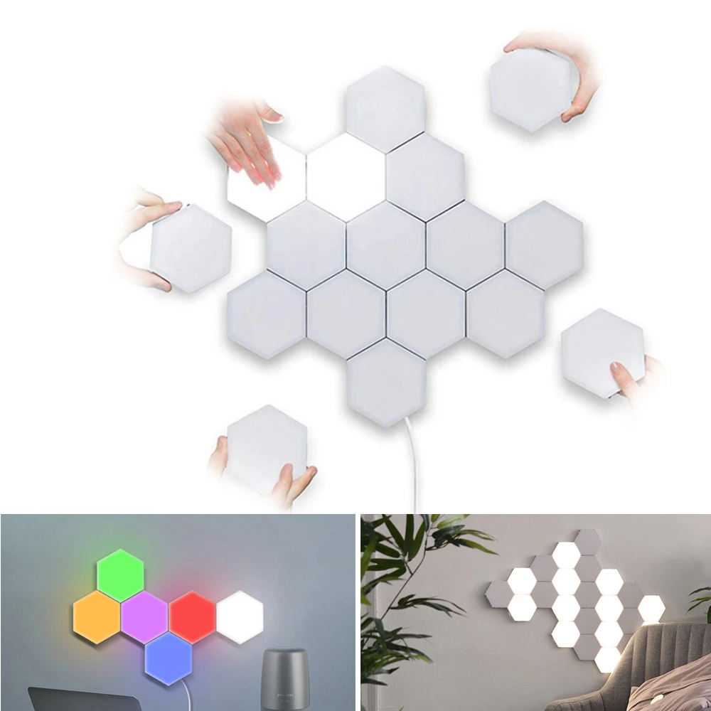 Модульная светодиодная осветительная система сенсорного типаШестигранные модусветильник льники соединяются между собой магнитным притяжением, которые можно использовать как настенные светильники, с сенсорным режимом затухания и затухания, которые можно выключать и включать легким касанием или легким движением.