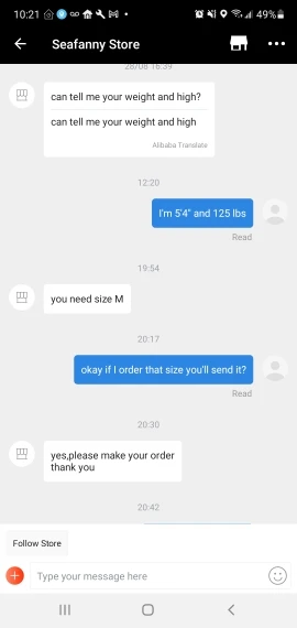 Сначала я заказал и Размер S, но я отменил свой заказ, потому что я не был уверен в размере, плюс он стал дешевле. Продавец сделал ошибку и отправил Размер S, а также опроверг меня. Эта ошибка на ней, и у меня не сложилось впечатление, что я должен был заплатить за тот, который она случайно отправила. Я хотел заказать свой правильный размер, поэтому я связался с ней и спрашивал, какой размер она будет рекомендовать. Она сказала, что у меня будет размер M. Я заказал размер M, согласно ее рекомендации. Я спрашивал, отправит ли она Размер M, и она сказала «да» (у меня есть доказательства). После того, как она пришла к оплате, она сказала мне, что не будет отправлять Размер M, и что платеж пришел к заказу, который она случайно отправила после того, как я отменил его. Она сказала мне, что заказ был доставлен, но я проверил почтовый ящик, и там ничего нет. Когда я связался с ней, она начала кастись очень непочтительно и непрофессионально. Скажите мне, что я должен умереть среди многих других вещей. У меня есть защита экрана прилагается