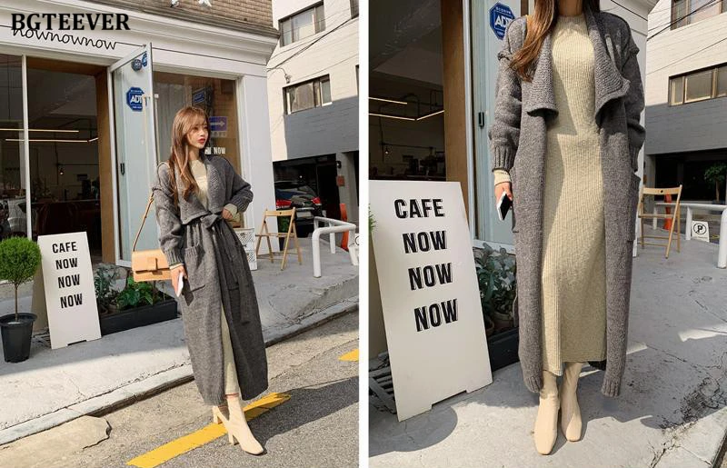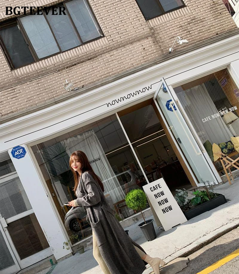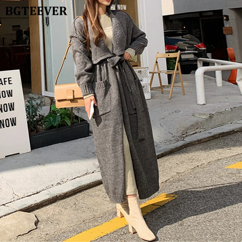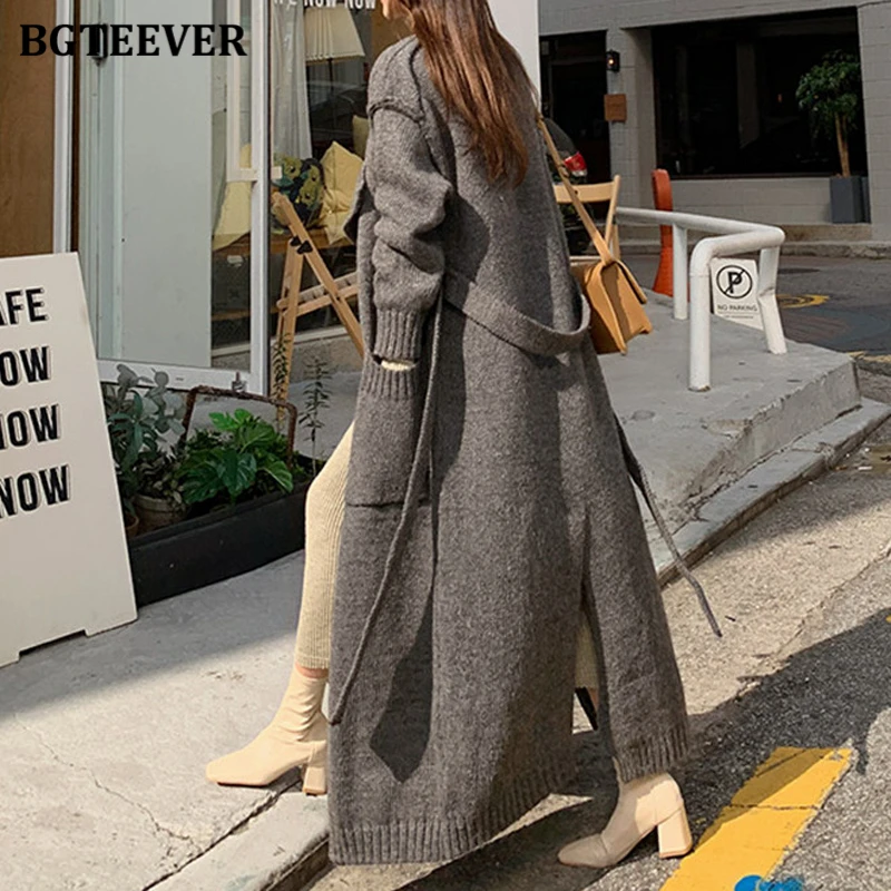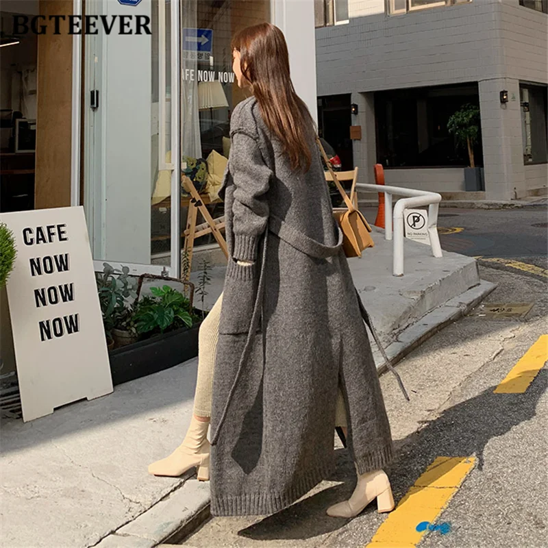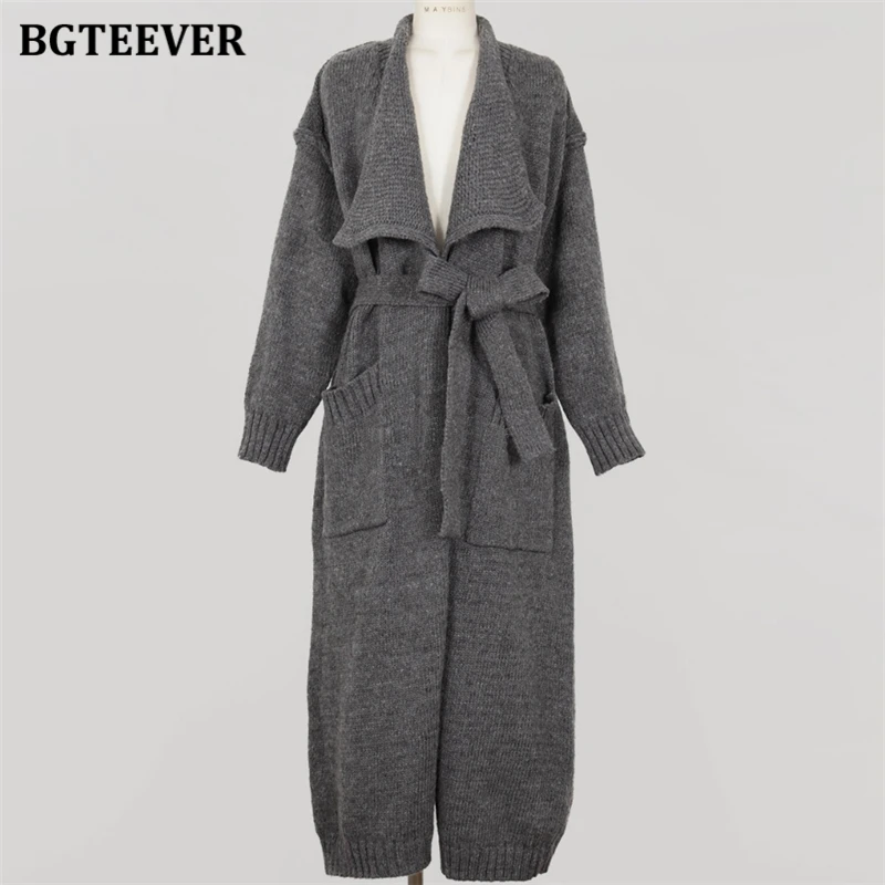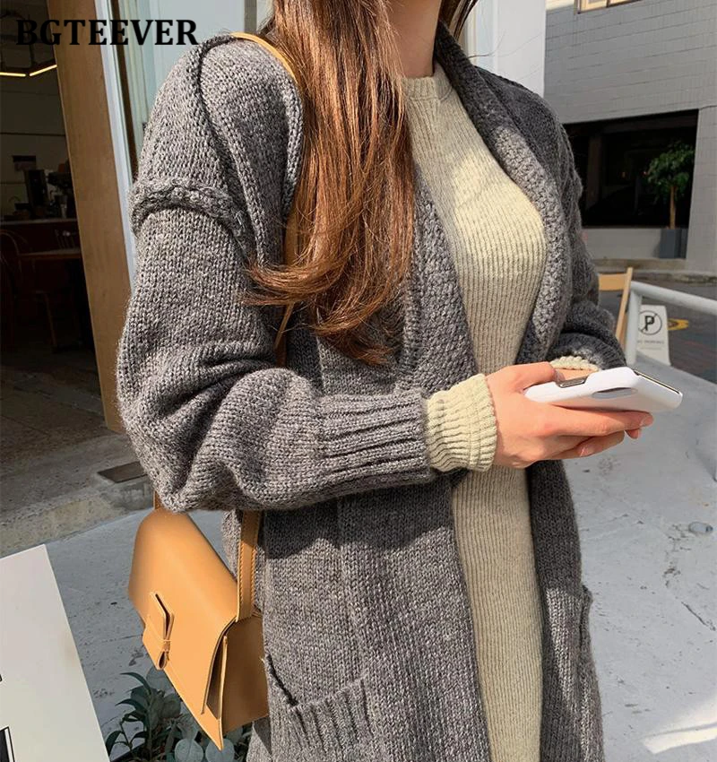 Женский длинный вязаный кардиган BGTEEVER, теплый свободный Свитер оверсайз с открытым стежком и карманами на шнуровке, зима 2020
