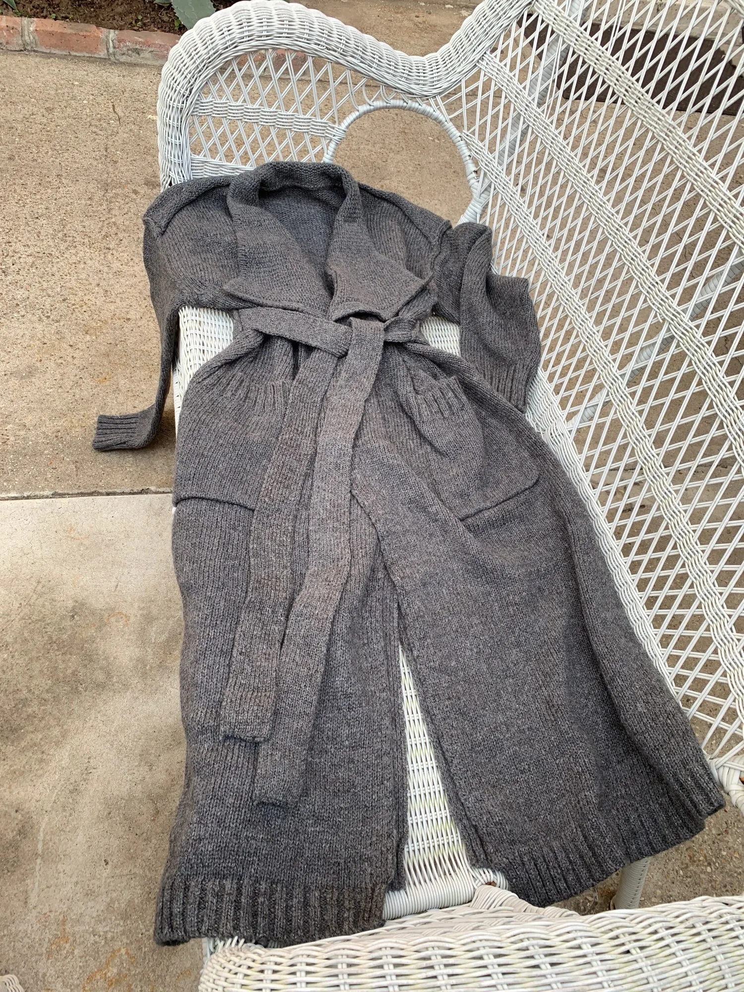 Hoy puedo decir que lo tengo en mis manos!! Tejido grueso, largo, apto para mujeres altas!! Yo soy bajita, me llegará hasta los pies.1.50 altura... pero todo bien, trae cinta, abertura la parte de atrás,no trae botones.
