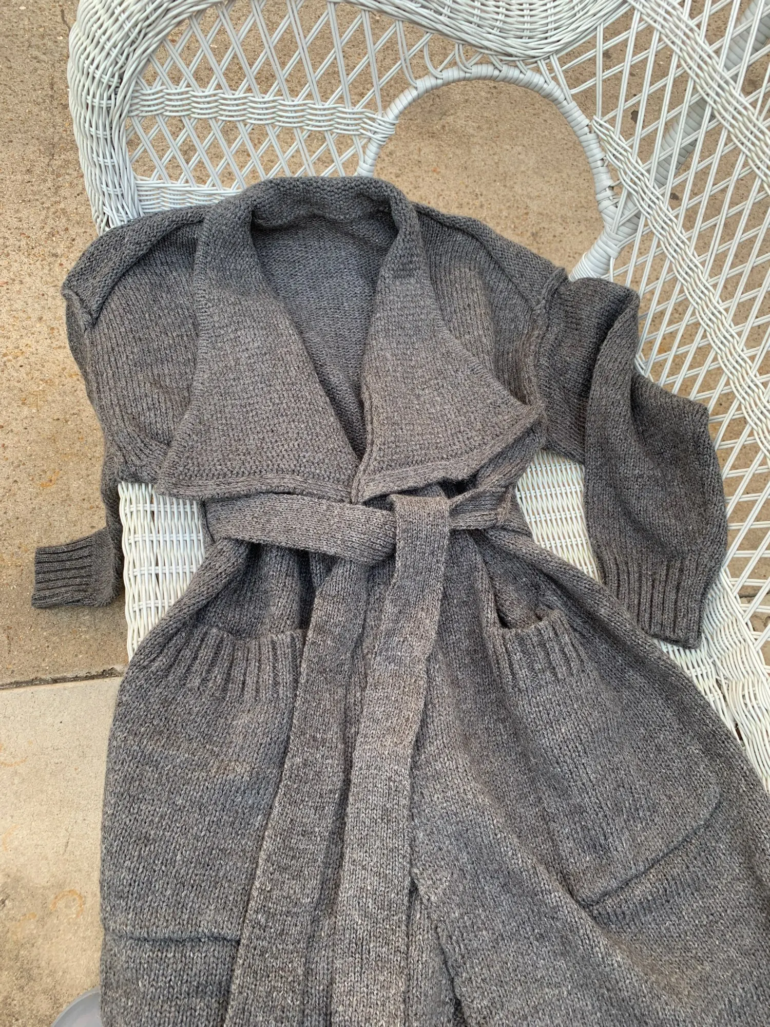 симпатичное вязанное пальто. хорошая плотная вязка. присутствует неприятный запах.