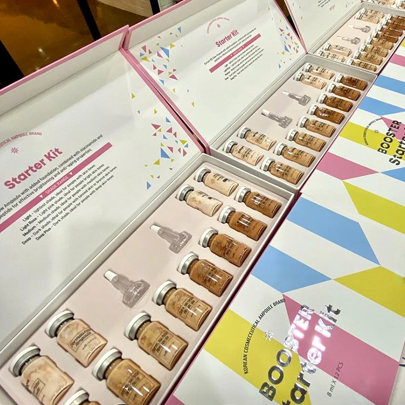 Стартовый набор Booster Ampoule содержит пять различных ампул в одной коробке. Как использовать Поместите небольшое количество на всю очищенную кожу лица и шеи и гладьте ее до полного впитывания. Используйте утром. Избегайте прямого контакта с глазами. При возникновении контакта краску с водой и обратитесь к врачу. Может использоваться в комбинации с машиной МТС. Ингредиенты Вода, глицерин, масло семян, полиглутаминовая кислота Титан диоксид, Алюминий гидроксид, триэтоксикаприлилсилан, пропиленгликоль, циклопентасилоксан, циклогексасилоксан, цетиловый этилгексаноат, минеральное масло, полисорбат 80, стеариновая кислота, цетеариловый спирт, хлорфенезин, глицерил стеарат, Сорбитан стеарат, гидрокситилцеллюлоза, аллантоин, диметикон, Сорбитан кункиолей, экстракт листьев камелии Синенсис, Bambusa экстракт вулгараса, экстракт Borago Officinalis, экстракт кожуры цитрусовых Unshiu, экстракт плодов лигустрим Japonicum, экстракт корня Cnidium Officinale, экстракт плодов риуса Semialata galata Galla, экстракт фрукта Opuntia coccinelliferellifera prunus Persica (персик) экстракт ядра, экстракт листьев Pinus Sylvestris, экстракт корня Lobata, Экстракт листьев гинкго билоба, экстракт корня трихосантоса кириловии, динатрия ЭДТА, феноксиэтанол, Токоферил ацетат, Rh-Oligopeptide-1, красный оксид железа, черный оксид железа, желтый оксид железа, аромат. Информация о продукте: Размер упаковки: 1 коробка содержит: 12 флаконов в коробке (смешанные продукты).