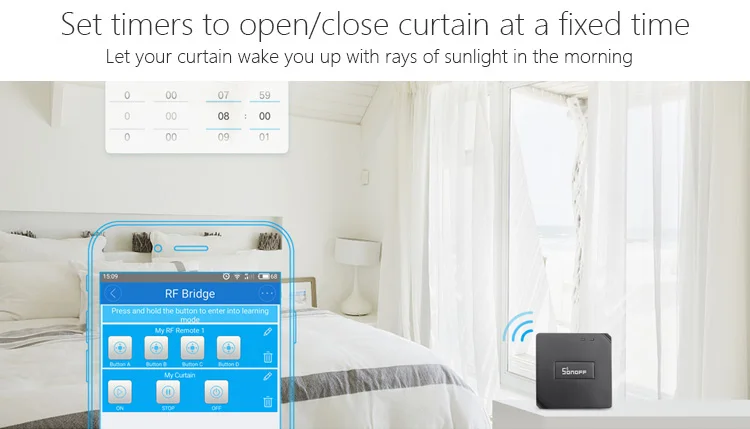 Широкий диапазон управления: для управления радиочастотными устройствами 433 МГц с радиочастотным пультом 433 МГц, вы должны оставаться в помещении. Радиочастотный мост Sonoff помогает переключать сигнал, позволяя управлять радиочастотными устройствами 433 МГц из любого места в любое время