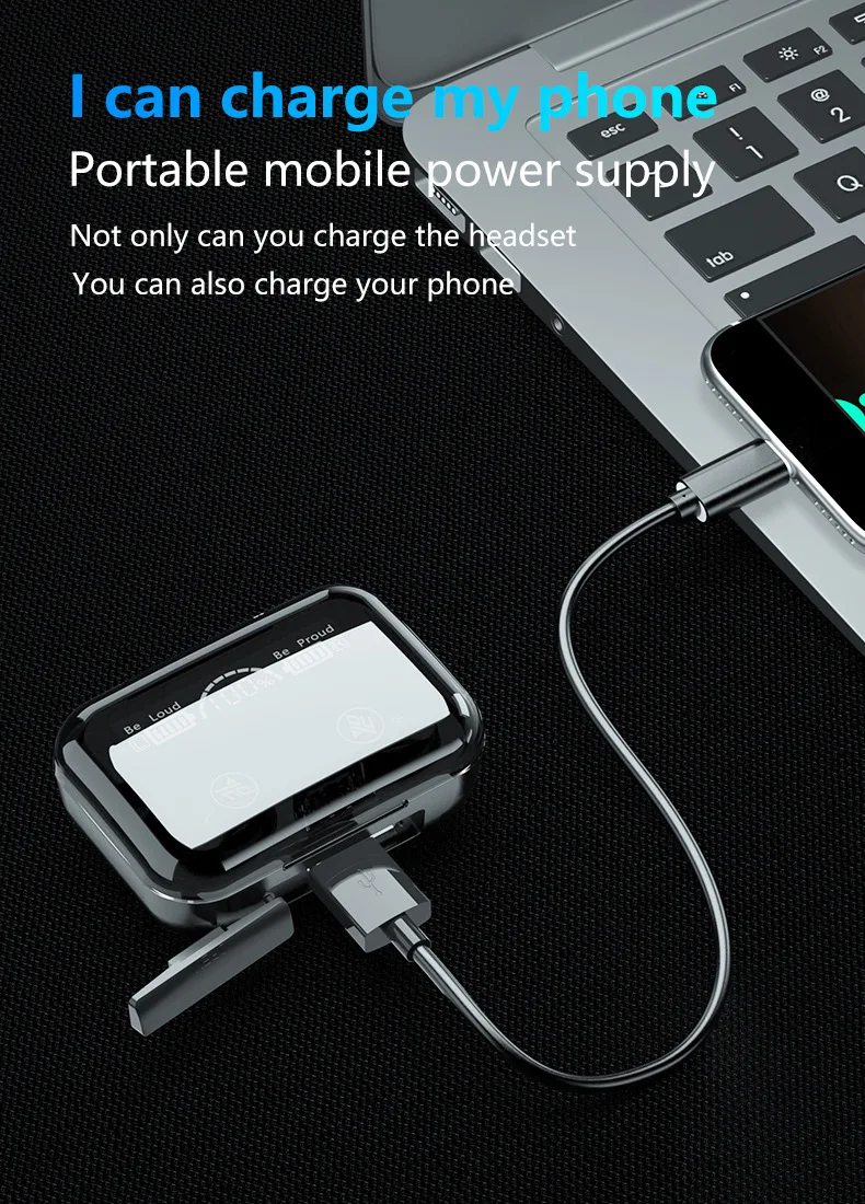Пара наушников имеет эргономичный дизайн, автоматическое соединение, стереозвук, сенсорное управление. IPX7 водонепроницаемый, подходит для занятий спортом и других упражнений. Зарядное устройство может отображать электричество наушников и зарядную коробку, а также заряжать мобильный телефон. Особенности: Эргономичная косая конструкция уха, удобно подходит для ушного канала. Цифровой дисплей зарядного устройства четко показывает мощность, зарядное устройство также может заряжать мобильный телефон. Чип BT 5,1, Расстояние соединения 10 м, стабильная производительность, высокая передача, низкое потребление и сильная совместимость. Встроенная высокочувствительная сенсорная панель, сенсорное управление включением/выключением, ответ на вызов/ответ на вызов, музыкальная пауза/воспроизведение и голосовой помощник. IPX7 водонепроницаемый и защищенный от пота, подходит для занятий спортом и других упражнений. HiFi высокое качество звука, хороший опыт прослушивания.