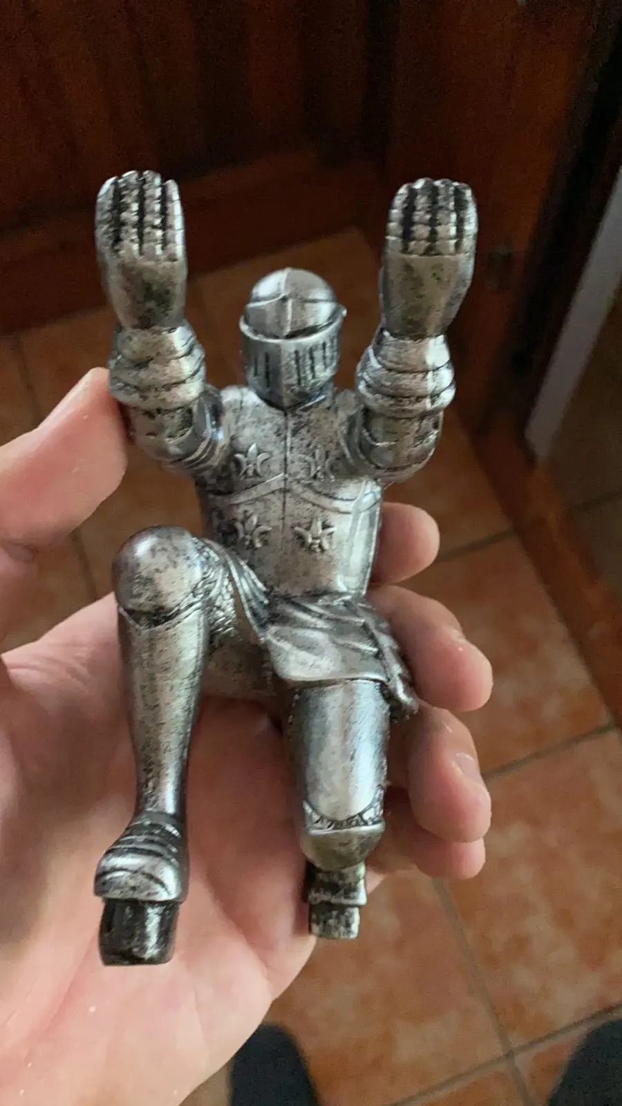 Получили.Нравится.Детализация рыцаря слабовата,он из полимера-пластмассы как и меч,основание металлическое.