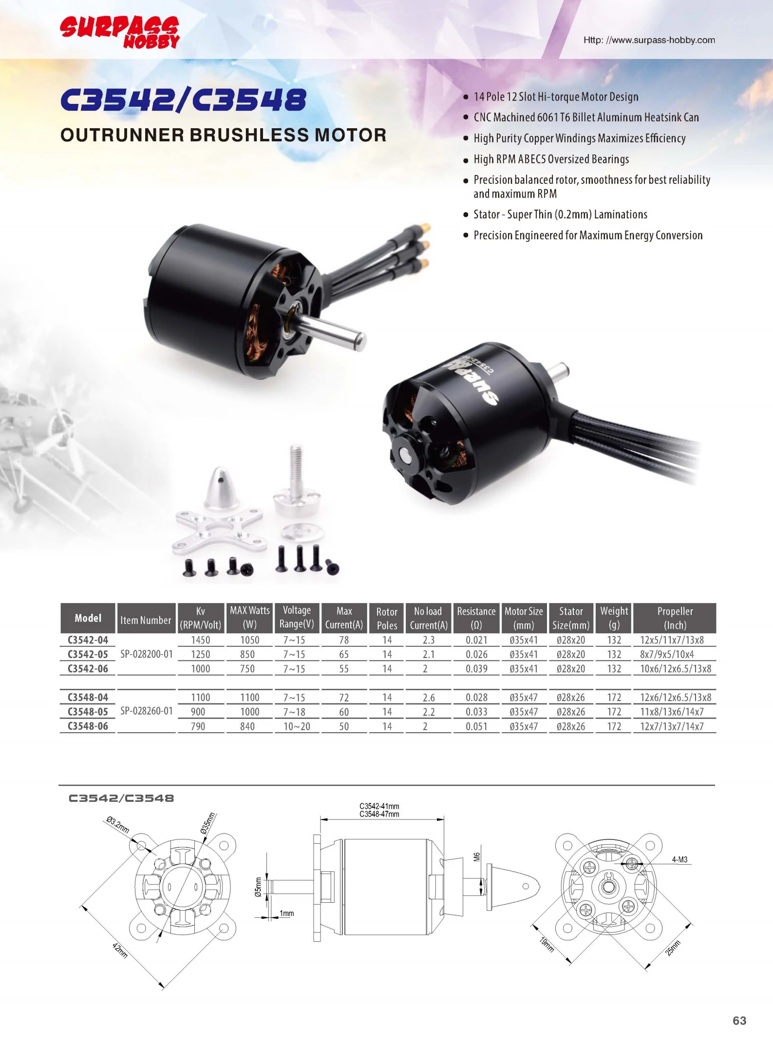 Двигатель бесщеточный SURPASS HOBBY C3530 C3536 C3542 C3548, 14-пол...