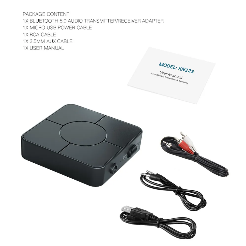 Технические характеристикиМодель: KN326Технологии: Bluetooth 5,0Рабочий диапазон: до 10 м/33 футов (без каких-либо блокирующих объектов)Название сопряжения: KN326Время зарядки: 2 часаВремя работы: RX:6 часов; TX:5 часовТип батареи: литий-полимерный (200 мАч)Размеры: 44 × 44 × 12 ммВес: 65 гПосылка1x Bluetooth 5,0 аудио передатчик/приемник адаптер1x микро USB кабель питания1x RCA кабель1x3,5 мм Aux кабель1x Руководство пользователяОсобенности:1. Этот Чрезвычайно портативный, легкий беспроводной аудио передатчик и приемник-идеальное беспроводное аудио решение для широкого спектра ситуаций и использования2. Режим передатчика:Беспроводная передача аудио с телевизора, не Bluetooth, домашней стереосистемы или CD-плеера на наушники или колонки Bluetooth3. Режим приемника:Беспроводная передача аудио с телефона, планшета или компьютера с поддержкой Bluetooth на проводные стерео, колонки или наушники4. Переключение между режимами передатчика и приемника с простым щелчком переключателя. Легко подключить, используя передовые технологии Bluetooth и 3,5 мм аудио кабель (все указанные аккумуляторы входят в комплект поставки).5. Супер-Портативное аудио-потоковое питаниеKN326 всего 44 мм (1,73 дюйма) и весит всего 18 г (0,63 унций), но имеет мощные возможности беспроводной потоковой передачи аудио. Вставьте этот передатчик и приемник в рюкзак или сумку для ноутбука и возьмите его на ходу без каких-либо усилий.6. Широкая Совместимость: с помощью прилагаемого 3,5 мм кабель и 3,5 мм до 2RCA кабель, этот приемник передатчик адаптер может широко использоваться на вашем компьютере, ноутбук, домашней стереосистеме, бумажное полотенце, кабель для наушников, смартфон, mp3-плеер, CD-плеер и т. Д.Включение питания: Нажмите и удерживайте кнопку включения/выключения, пока светодиодный индикатор не загоритсяВыключение: Нажмите и удерживайте кнопку включения/выключения, пока светодиодный индикатор не выключитсяЗарядка: используйте зарядное устройство DC-5V и зарядный кабель micro usb. Красный светильник включен во время зарядки. Когда аккумулятор полностью заряжен, включается синий светильник.Режим переключения:1)RX: режим приема, индикатор: синий светодиодный2)TX: режим передачи сигнала, индикатор светильник: Красный светодиодныйРежим RX:Имя сопряжения: KN326 в настройках Bluetooth телефона для сопряжения. Синий светильник мигает дважды в секунду во время процесса сопряжения, и синий светильник мигает один раз в три секунды после успешного сопряжения.Как использовать:1) Подключите один конец аудиокабеля к аудиовходу динамика, а другой-к аудио KN3262) подтвердите, что он находится в режиме RX (синий светильник-вспышка). Найдите Имя сопряжения в настройках Bluetooth телефона: KN326 нажмите для сопряжения.Режим TX:Режим TX будет автоматически искать другие устройства приема Bluetooth (такие как bluetooth-гарнитура, bluetooth-динамик, bluetooth-приемник и т. д.), Красный светильник Дважды Мигает во время процесса сопряжения, И Красный светильник мигает раз в три секунды после успешного сопряжения.Как использовать:1) Подключите один конец аудиокабеля к аудиовыходу устройств, а другой-к аудио KN3262) подтвердите, что он находится в режиме TX (красный светильник-вспышка). KN326 будет автоматически искать bluetooth-гарнитуру или bluetooth-динамик сопряжения.