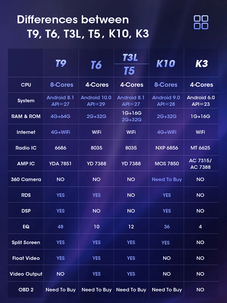 Введение специальных функций: ● DSP: такой же, как и эквалайзер на мобильный телефон, регулировка звукового эффекта, эквалайзер выше, а регулировка звукового эффекта более деликатная и насыщенная(Только R9)● Сеть 4G: вставьте sim-карту 4G через кабель RCA, вы можете подключиться к интернету(Только R9)● Вентилятор охлаждения: эффективное охлаждение(T3L/ T5 / T6 / T9 некоторые конфигурации бесплатны, другие модели нуждаются в дополнительной покупке)● Внешний Микрофон: решить проблему шумного окружающего звука во время вождения автомобиля и повлиять на качество звонков по Bluetooth(Поддерживается только T3L / T5/T6/T9 PLUS)● Разделенный экран(Поддерживается только T3L / T5/ T6 / T9)● Отображение плавающего окна(Только поддержка T3L/T5/T6/T9)● Видеовыход(Только поддержка T3L / T5 / T6)● Usb-рекордер: Подключите к радио через USB, после установки приложения вы можете просмотреть изображение рекордера в реальном времени и хранить видео файлы на радио(Требуется дополнительная покупка)● USB TPMS: подключение к радио через USB. После установки приложения, вы можете проверить давление в реальном времени каждой шины на радио. Когда значение давления является ненормальным, появляется предупреждающее окно(Требуется дополнительная покупка)● OBD: подключение к OBD устройству через Bluetooth, после установки приложения, вы можете просмотреть расход топлива автомобиля и другие данные на радио(Требуется дополнительная покупка)
