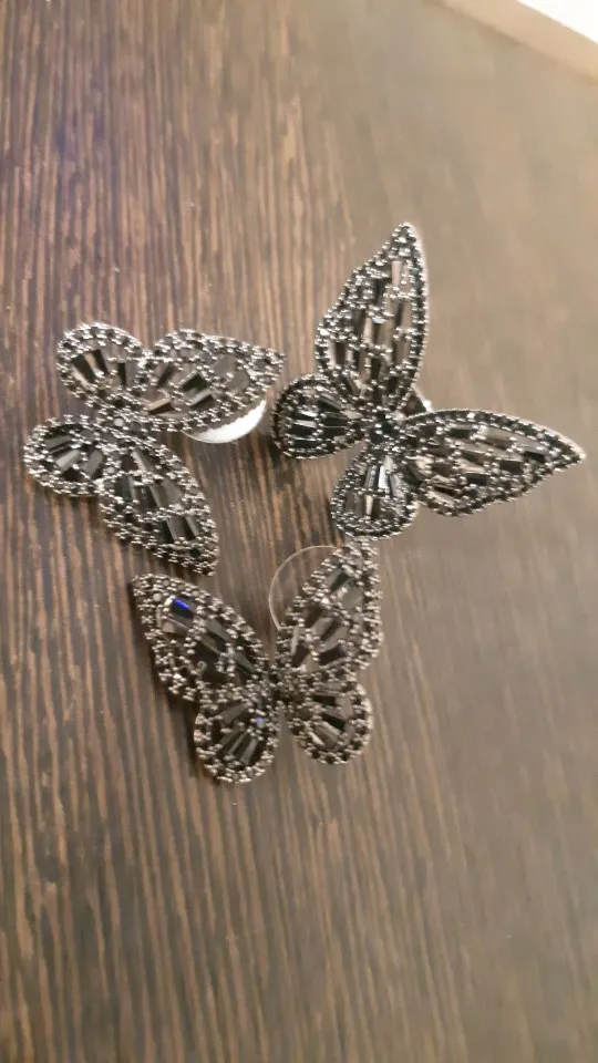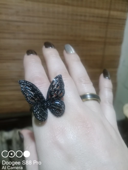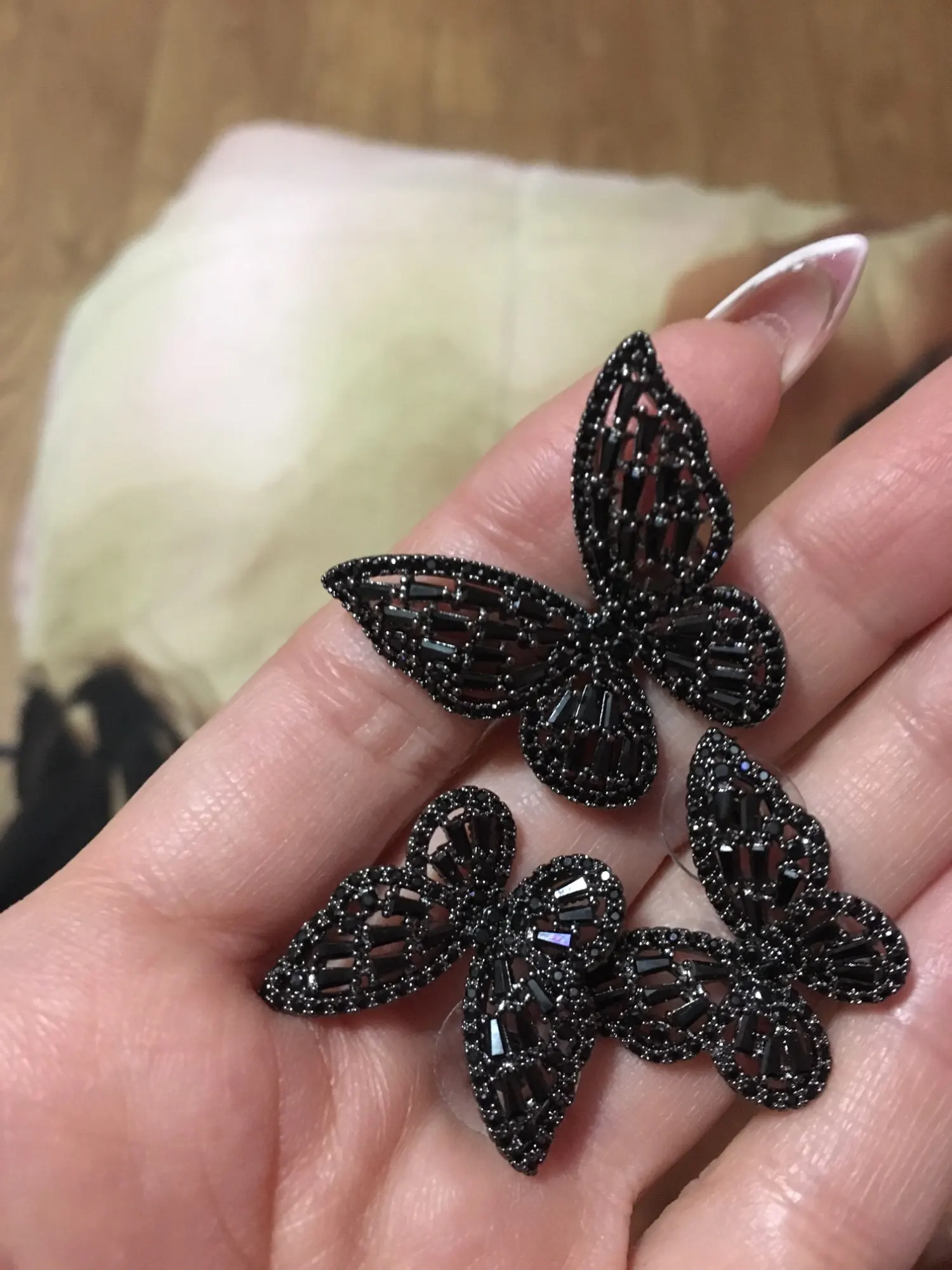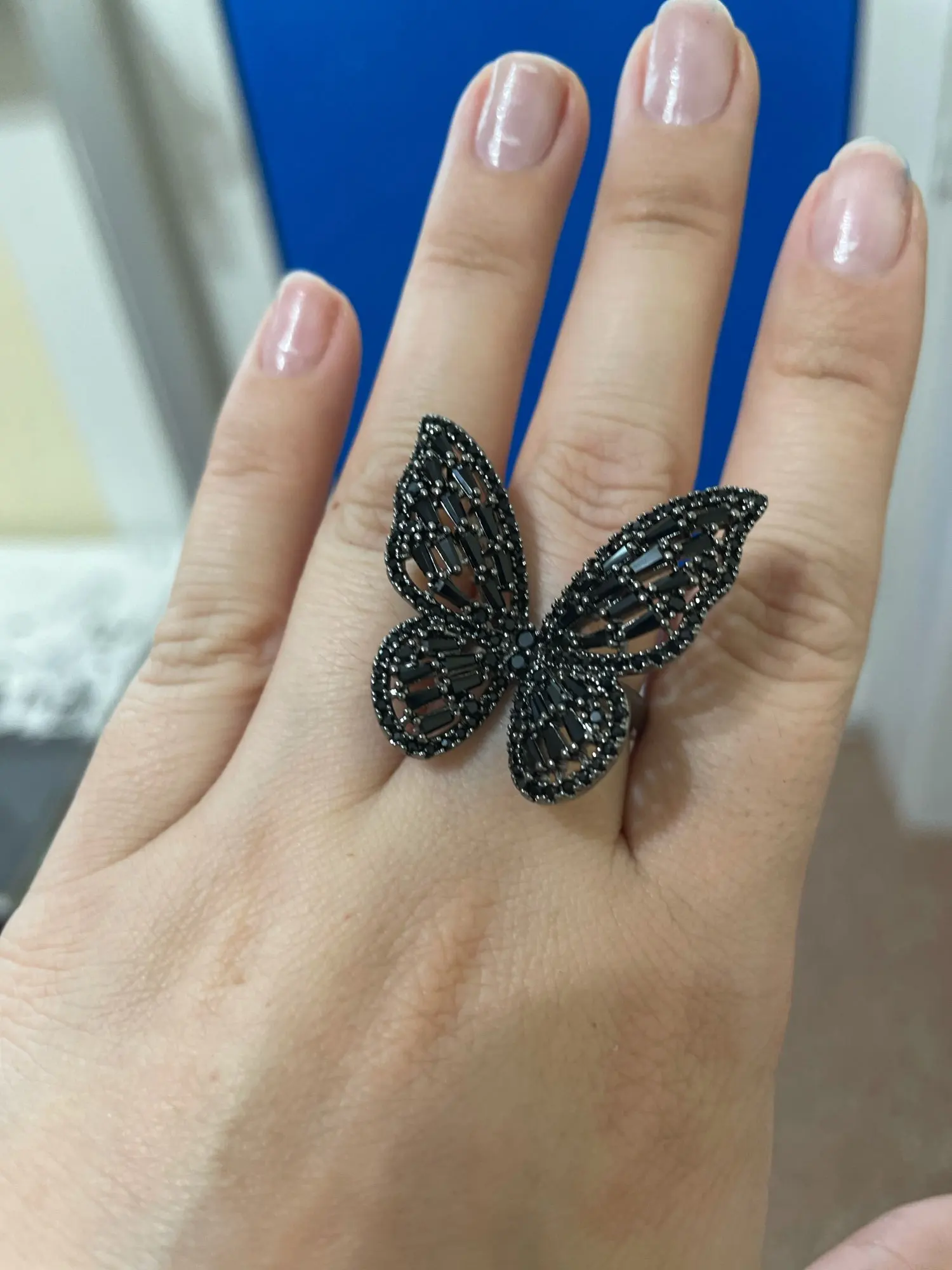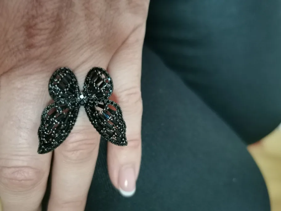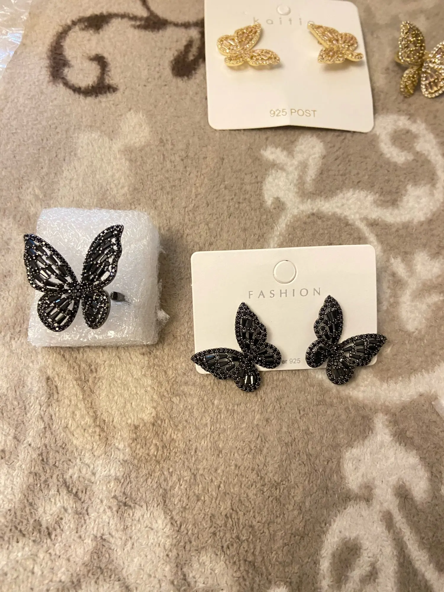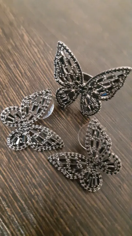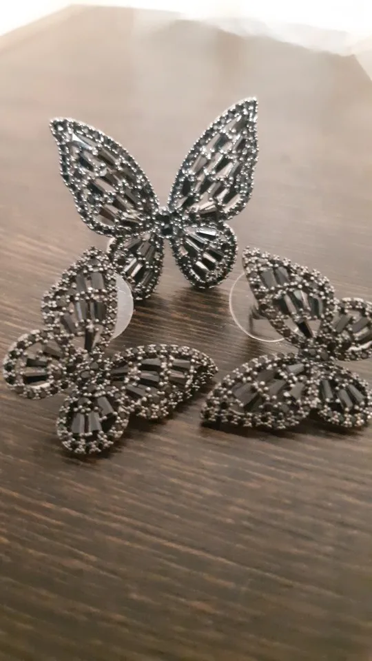 Отличный набор! Чёрное родирование,кольцо с регулируемым размером! Все стразы на месте, смотрятся, как чёрная шпинель! Очень изящные, ажурные, волшебные бабочки! Серьги - пусеты, доводчики силиконовые! Доставка быстрая! Спасибо!