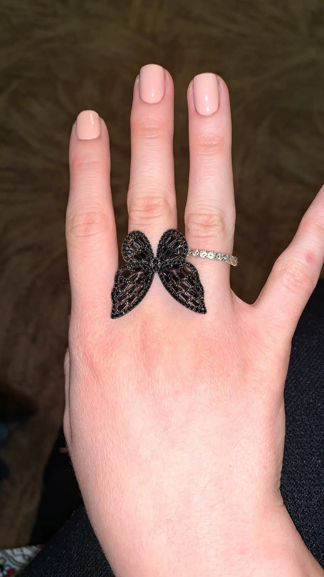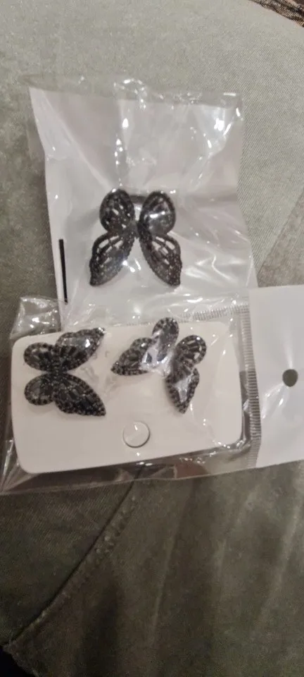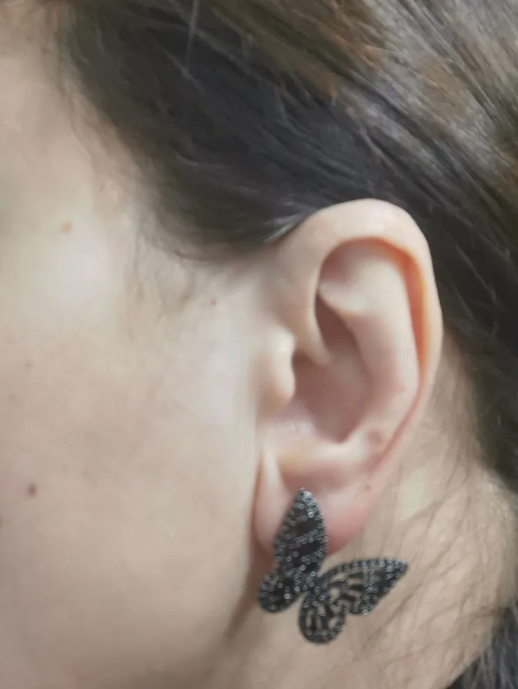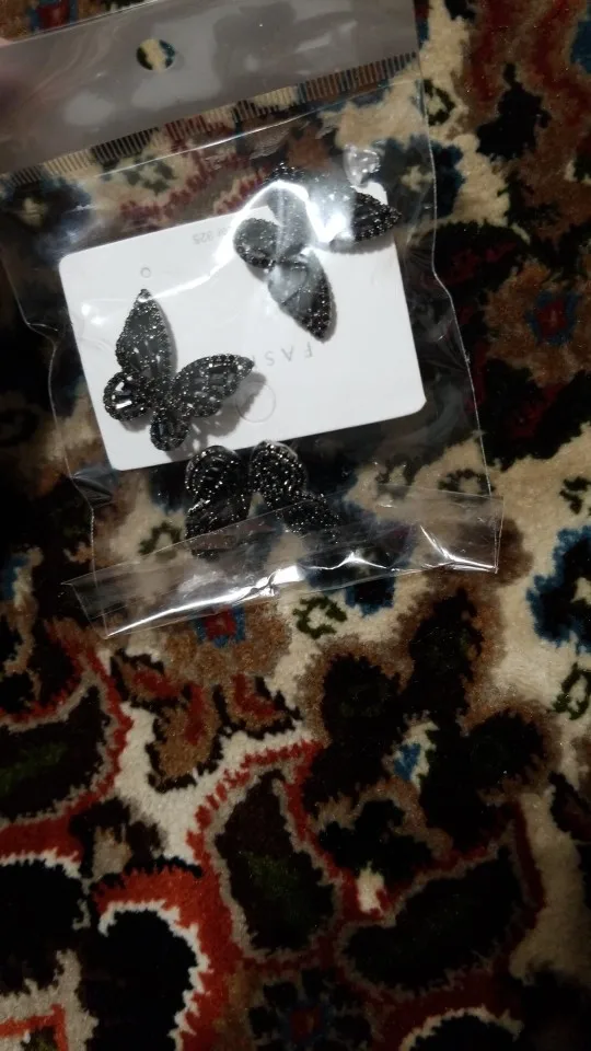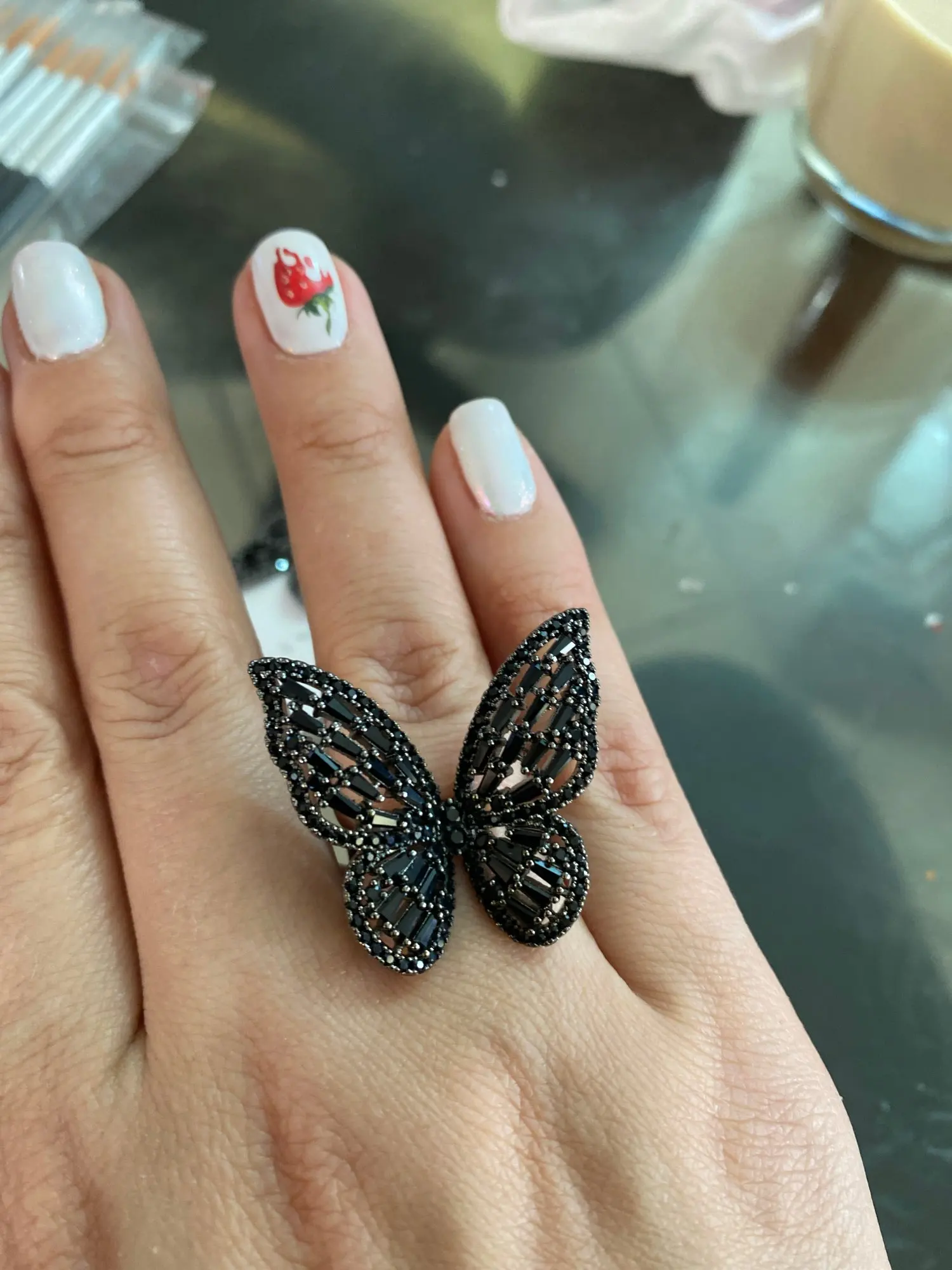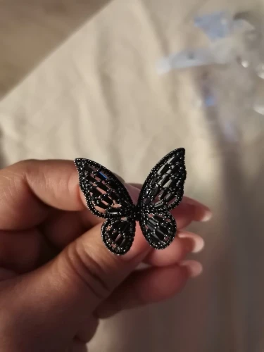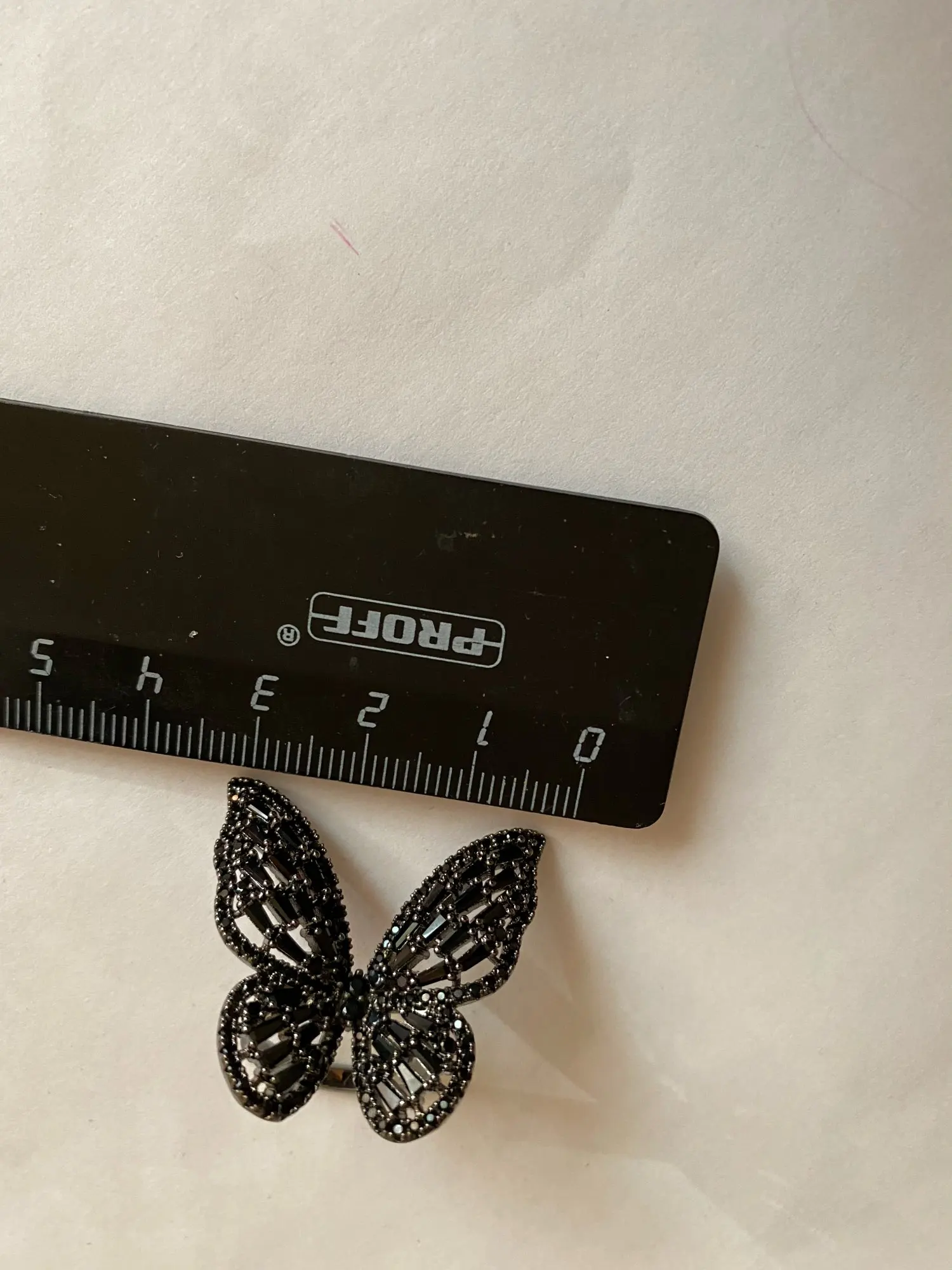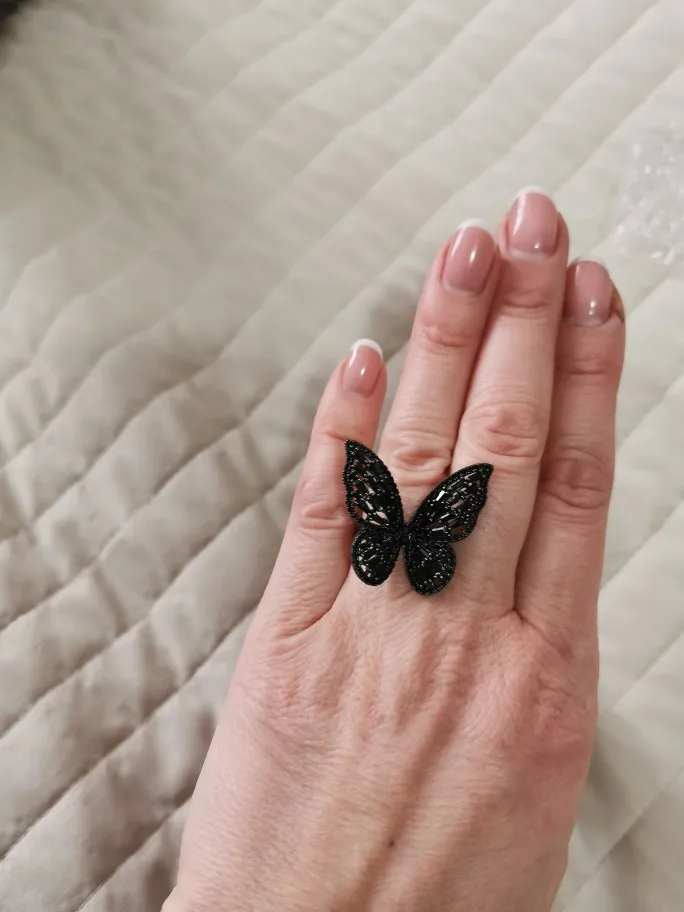 Отличный набор! Чёрное родирование,кольцо с регулируемым размером! Все стразы на месте, смотрятся, как чёрная шпинель! Очень изящные, ажурные, волшебные бабочки! Серьги - пусеты, доводчики силиконовые! Доставка быстрая! Спасибо!
