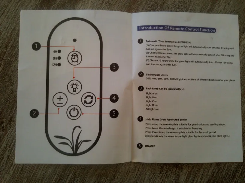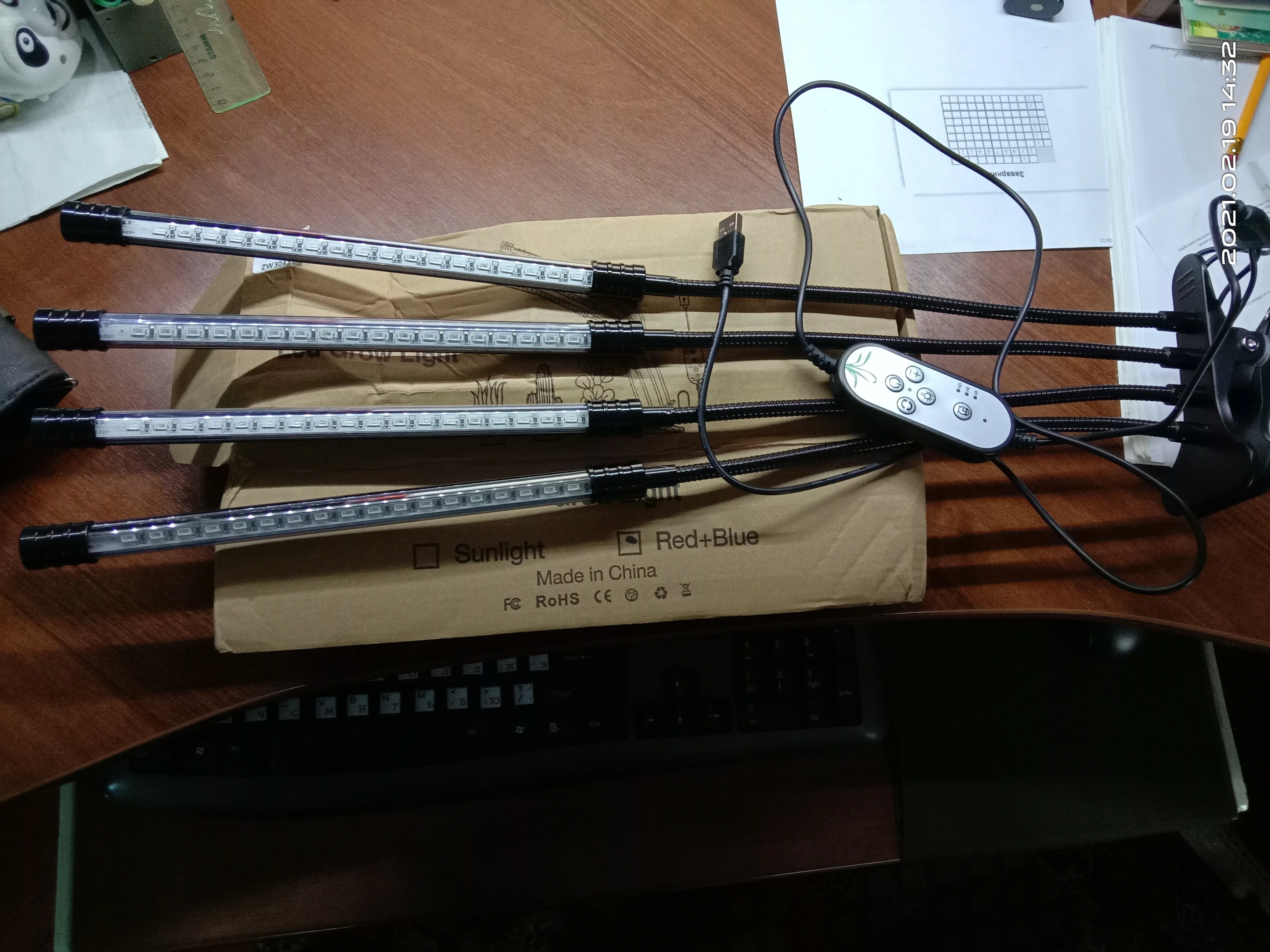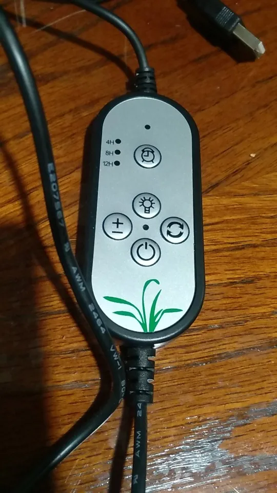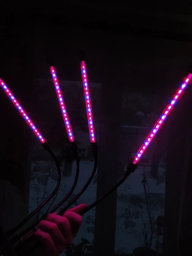 Отличная лампа. Три режима :синий свет, красный и оба сразу (фиолетовый) для разных стадий роста. Можно включать не все 4 лампы, а столько столько нужно (одну, две, три). Есть 3-х режимный таймер (4 часа работает, 20 нет; 8 часов работает, 16 нет ;12 часов работает, 12 нет). Можно регулировать интенсивность свечения 20%,40%,60%,80%,100%. Выход usb вилку нужно использовать свою. Вещь хорошая, рекомендую.