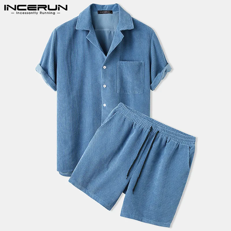 2021 Для мужчин вельветовые комплекты для активного отдыха уличная короткий рукав на пуговицах с отложным воротником, комплекты из футболки и шорты однотонные Цвет Для мужчин повседневные Костюмы S-5XL INCERUN
