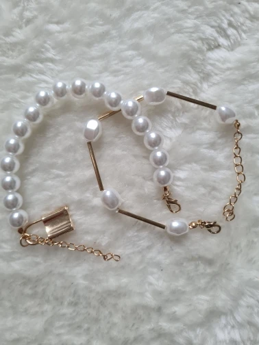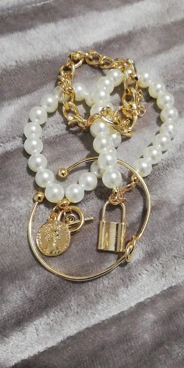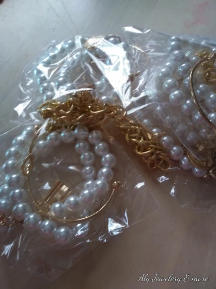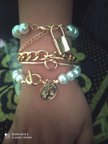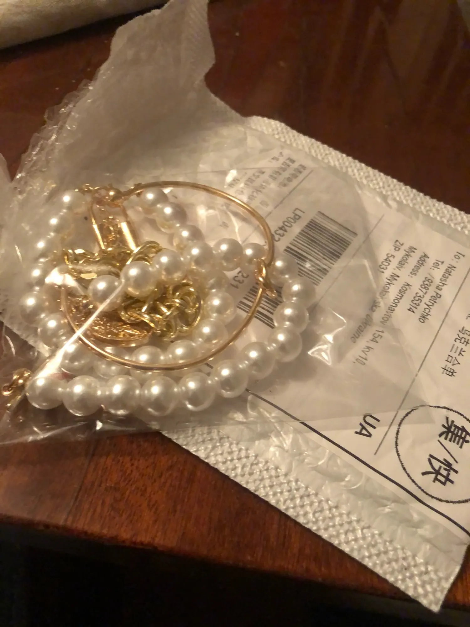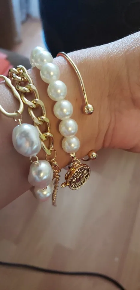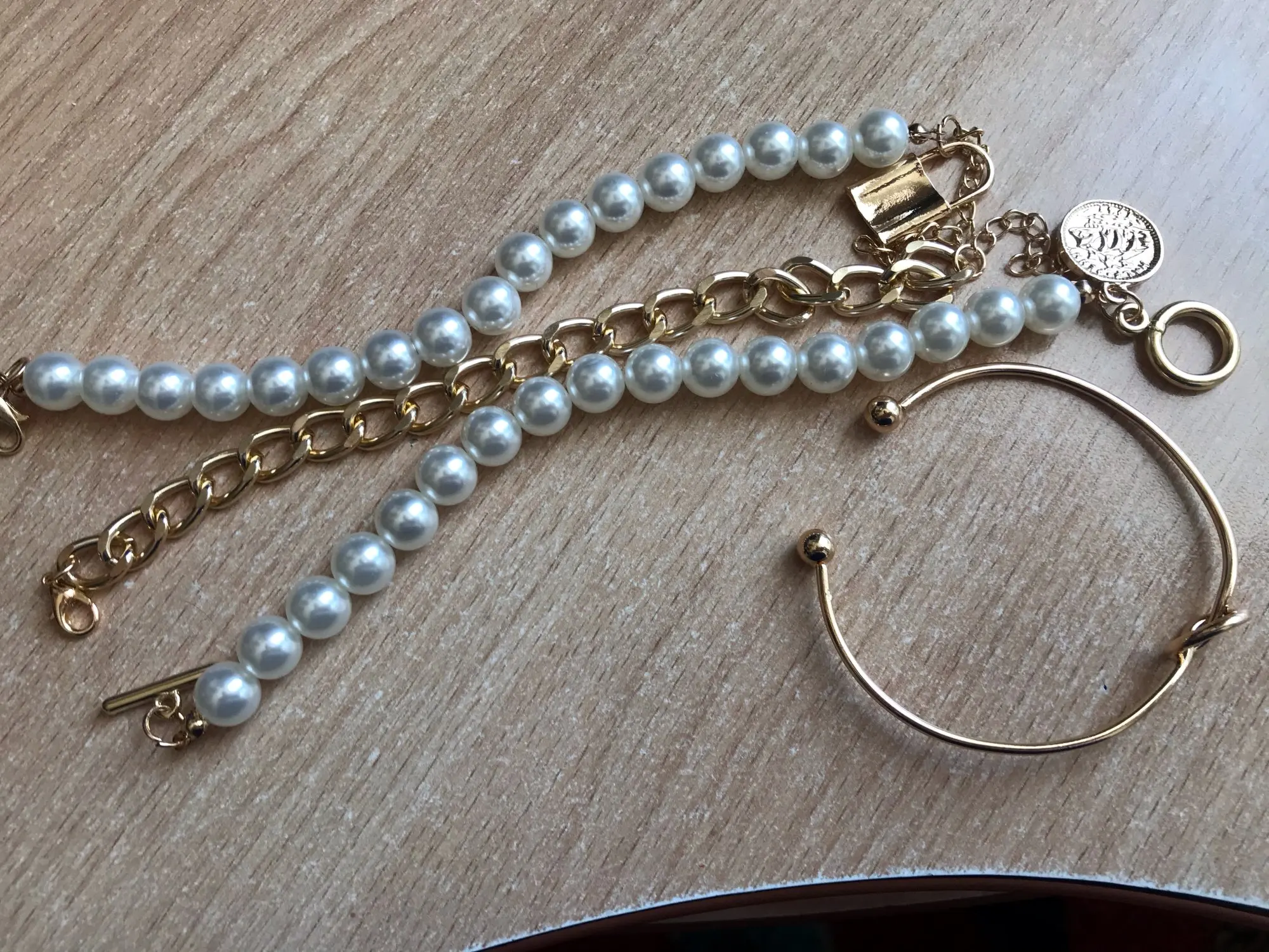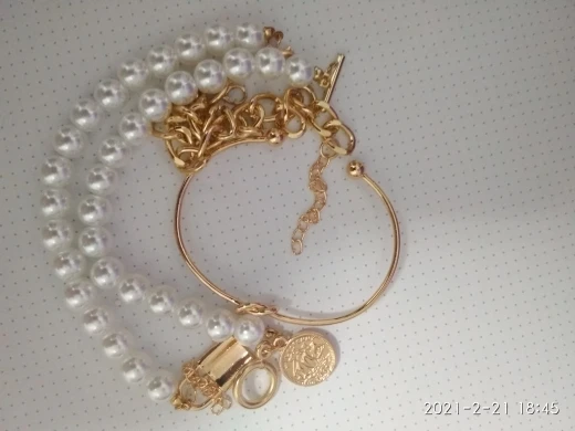 До Москвы посылка шла месяц. При рассмотрении Конечно видно , что жемчуг из пластика. Но когда жемчужный надет с другими, это не очень заметно. На мой взгляд красиво , где надеты металлические браслеты и один жемчужный. Медалька и сердечко выполнены аккуратно, браслеты очень легкие.