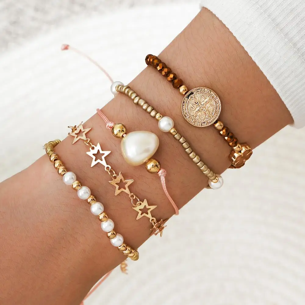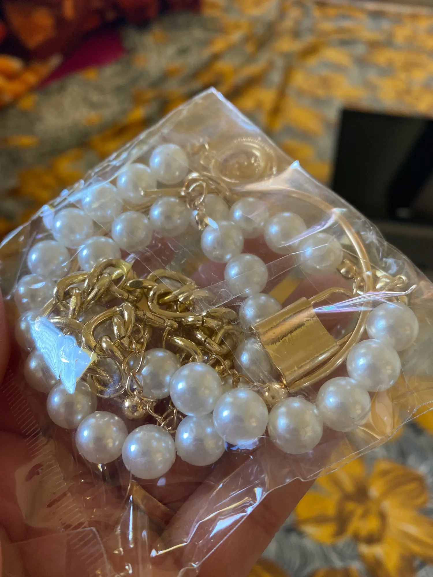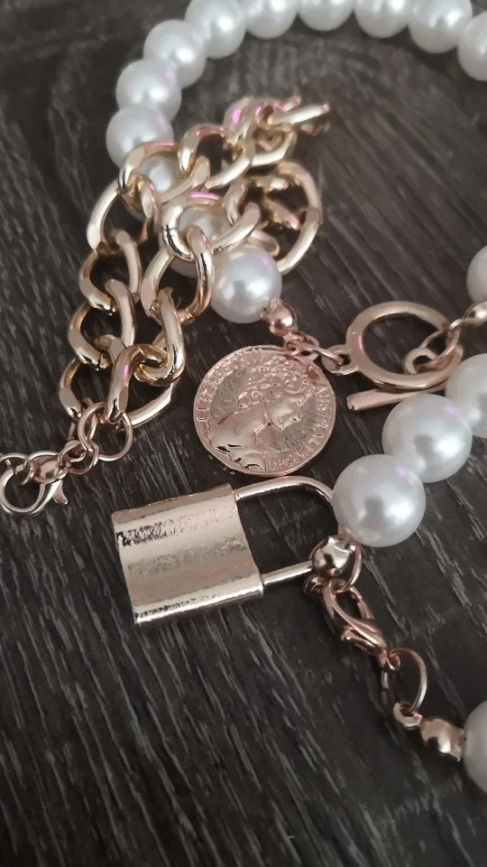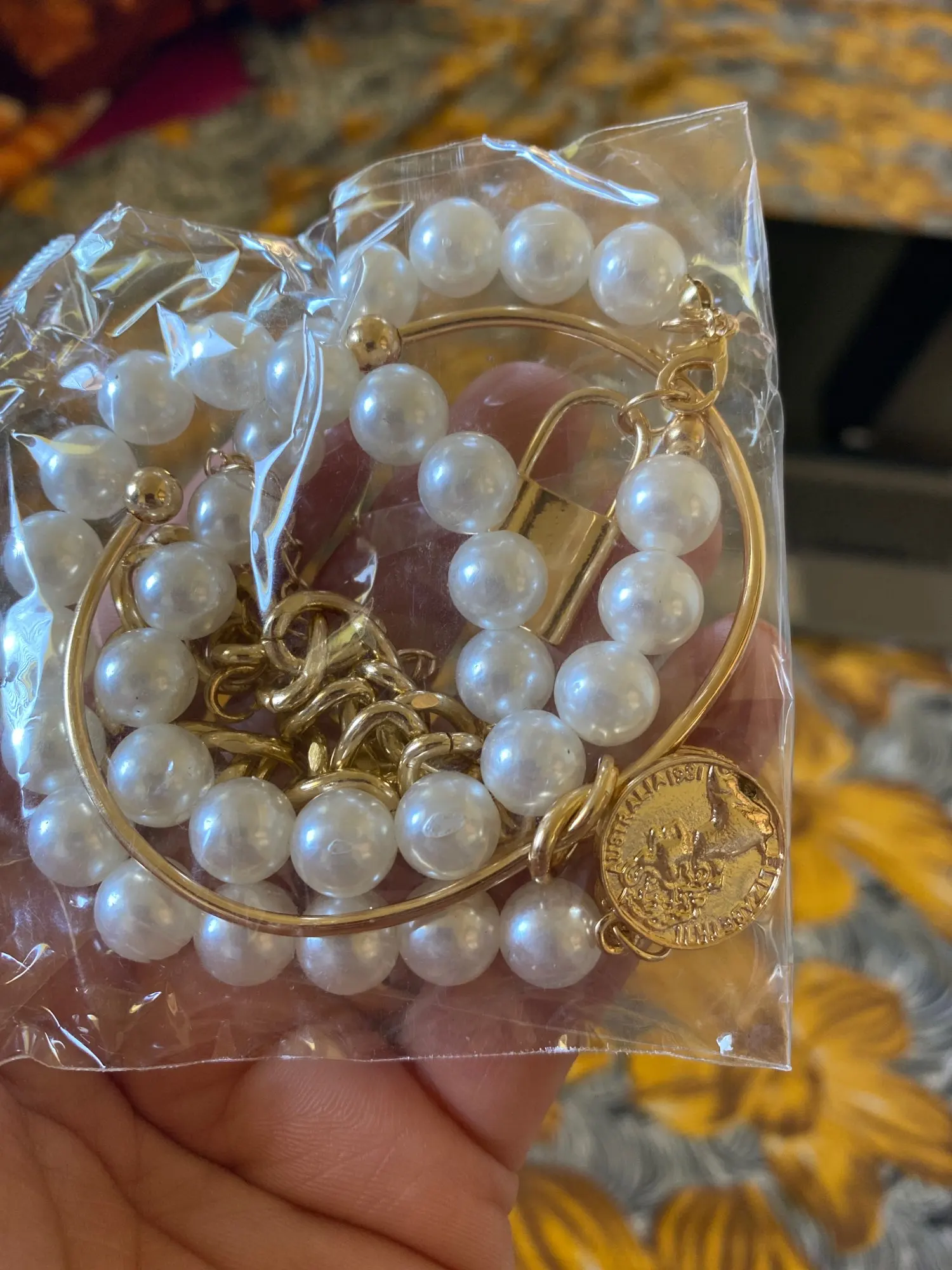 До Москвы посылка шла месяц. При рассмотрении Конечно видно , что жемчуг из пластика. Но когда жемчужный надет с другими, это не очень заметно. На мой взгляд красиво , где надеты металлические браслеты и один жемчужный. Медалька и сердечко выполнены аккуратно, браслеты очень легкие.