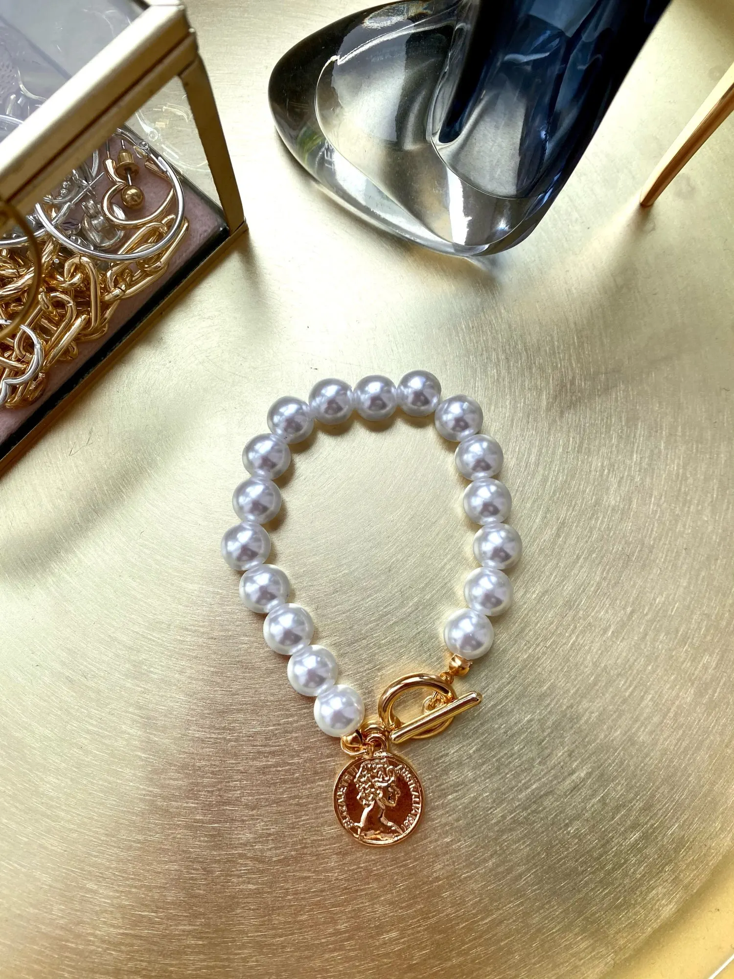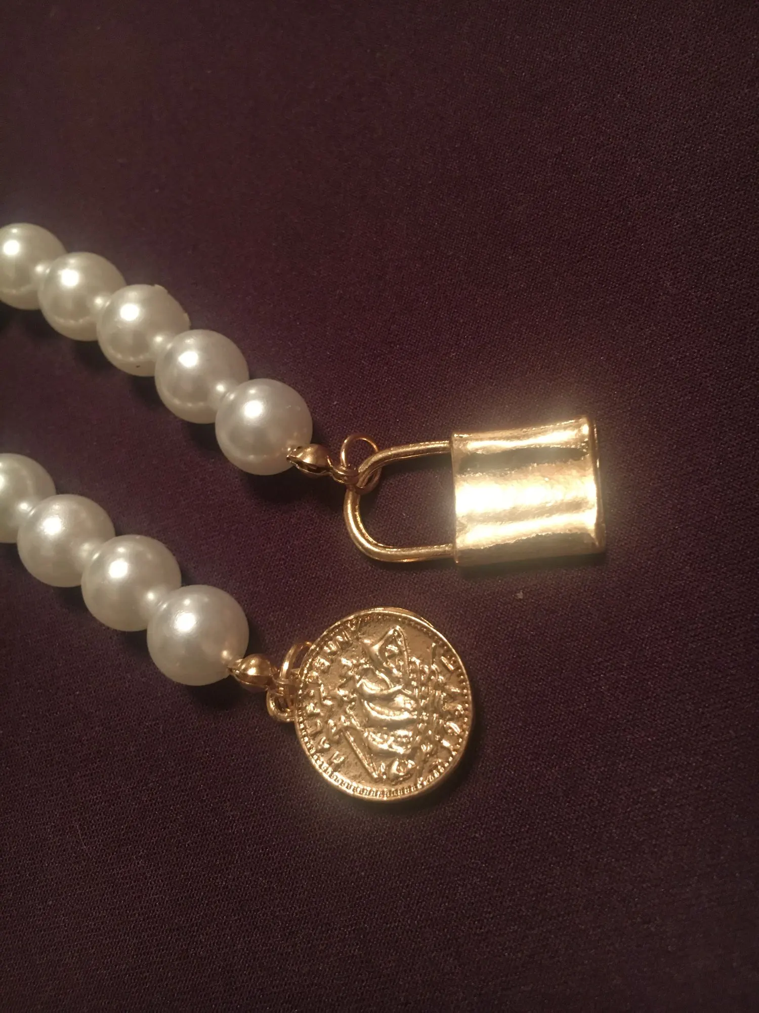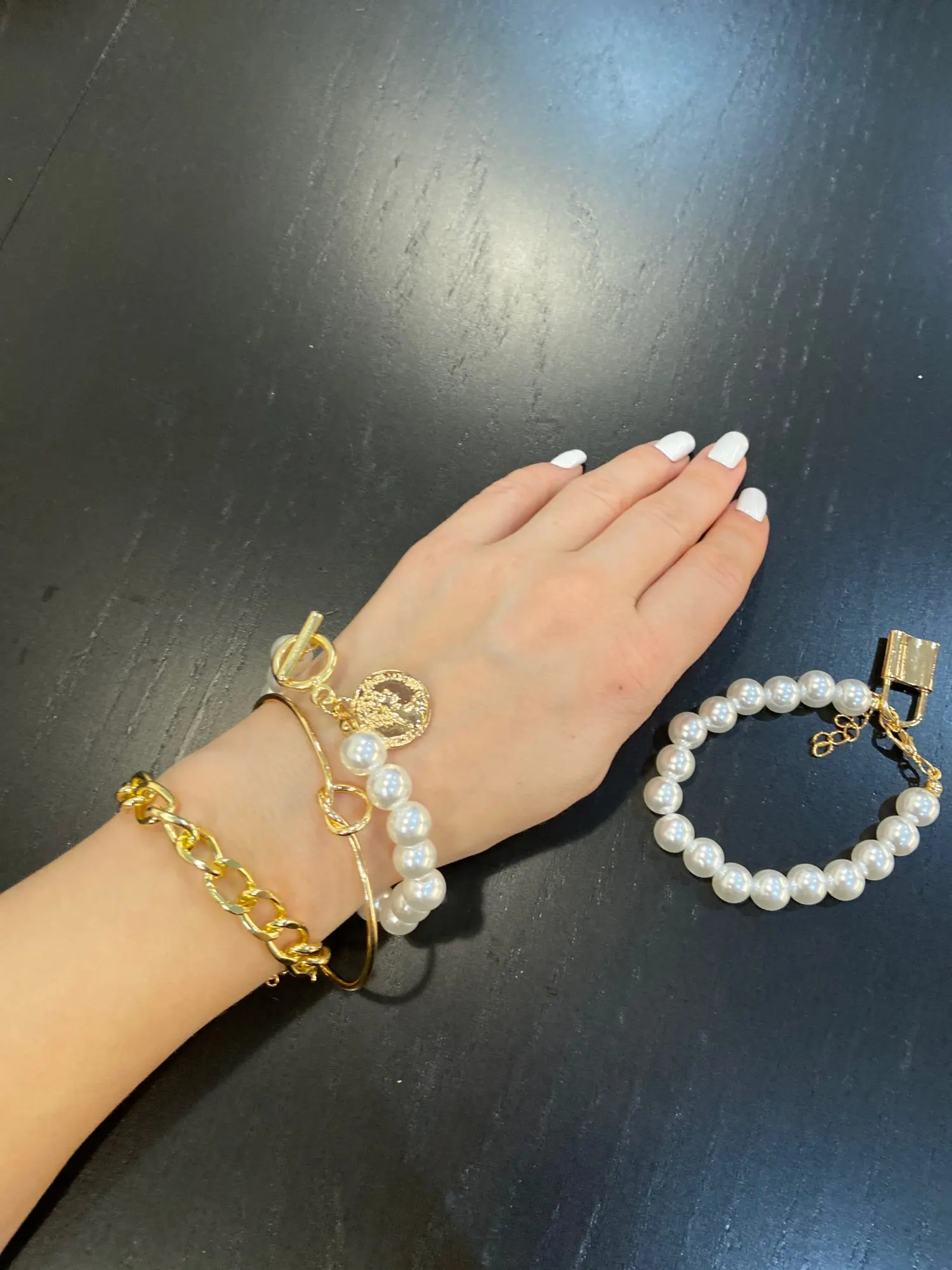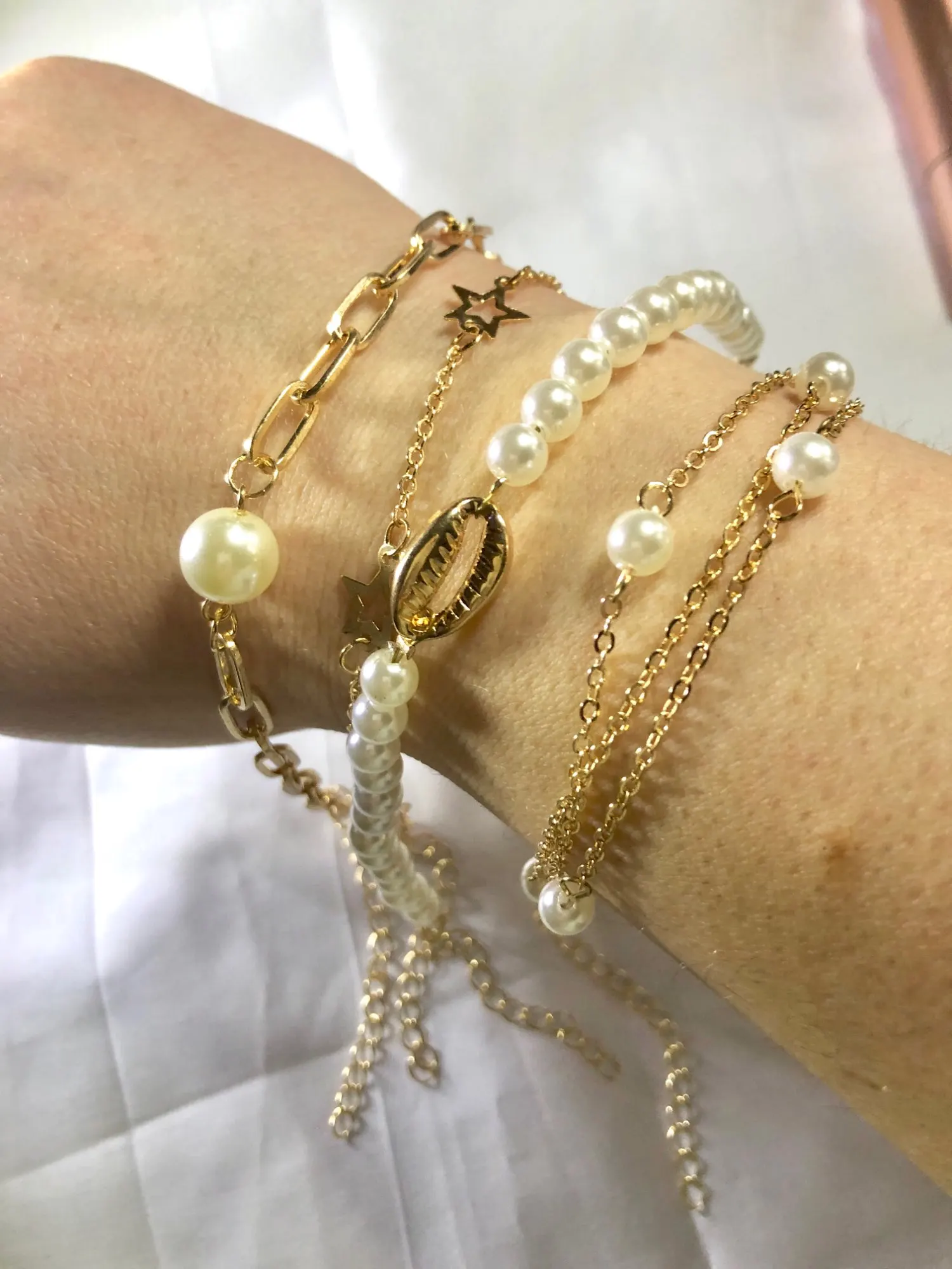 До Москвы посылка шла месяц. При рассмотрении Конечно видно , что жемчуг из пластика. Но когда жемчужный надет с другими, это не очень заметно. На мой взгляд красиво , где надеты металлические браслеты и один жемчужный. Медалька и сердечко выполнены аккуратно, браслеты очень легкие.