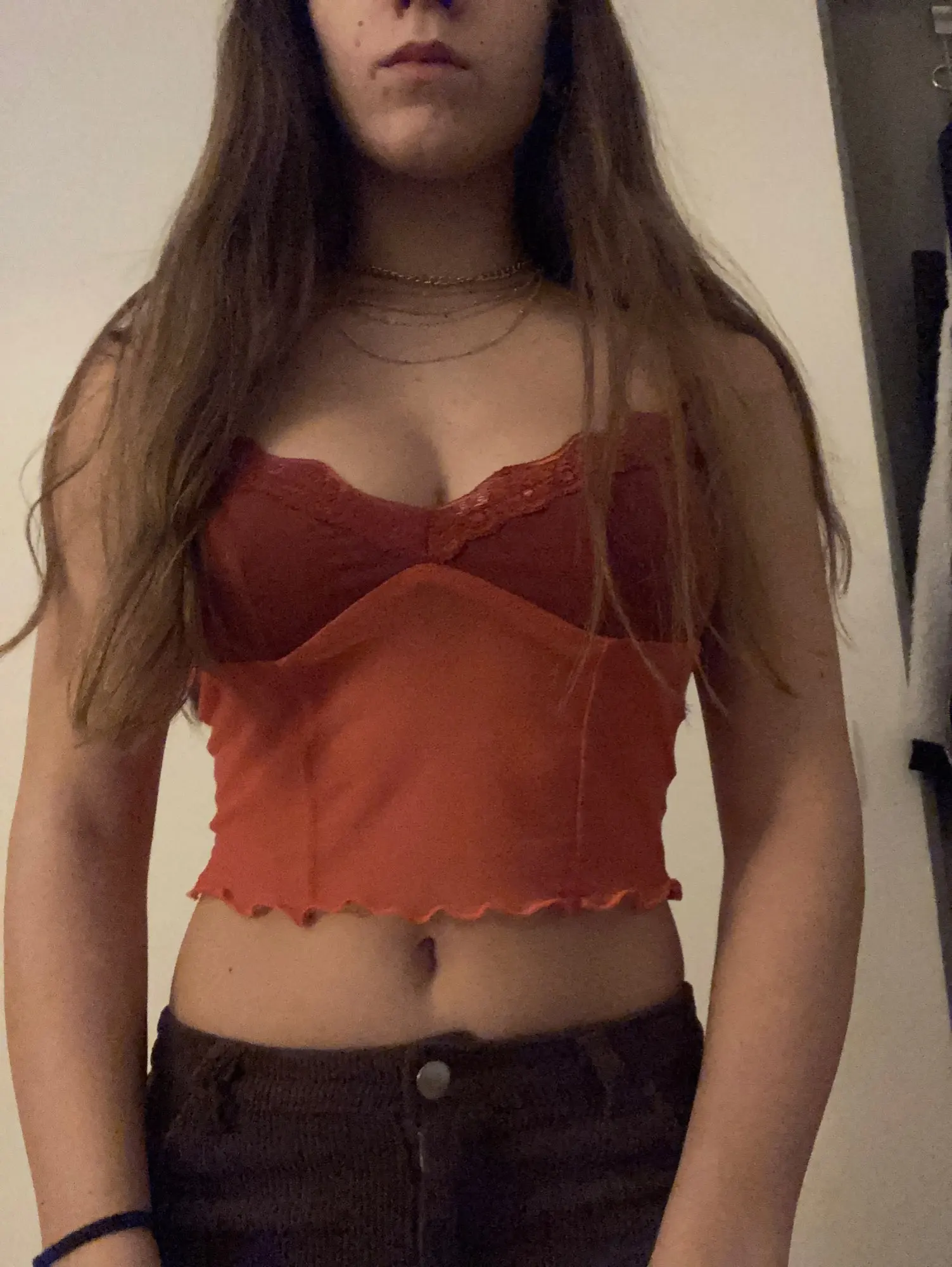 Все в порядке! Если у вас есть даже чашка c, она не будет работать, ваша грудь будет продолжать показываться в чистой части, если только это не то, в чем вы находитесь. Это выглядит не очень хорошо с бюстгальтером, так как верх должен служить как бюстгальтер, но у меня нет фотографий.