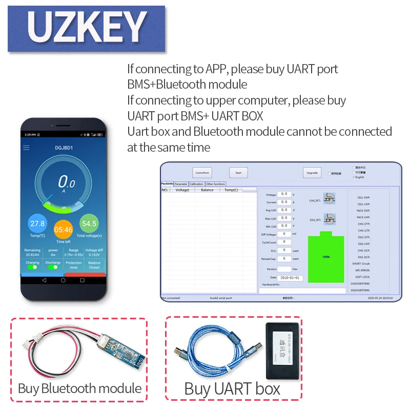 1. Если вам нужно подключить ваш мобильный телефон, вам нужно купить BMS с коммуникационная плата интерфейса UART порт или коммуникационная плата интерфейса UART порт, а затем добавить модуль bluetooth.2. Если вы Подключите компьютер только для чтения данных, вам нужно купить BMS, а затем добавить UART box,3. Примечание: модуль Bluetooth/UART box и ЖК-дисплей не могут быть использованы одновременно, из-за того, что они могут быть подключены только с одним общим портом4. Если вам нужно подключить ПК и мобильный телефон, пожалуйста, купите UART/RS485 double-communication BMS, затем купите модуль Bluetooth и Модуль RS485