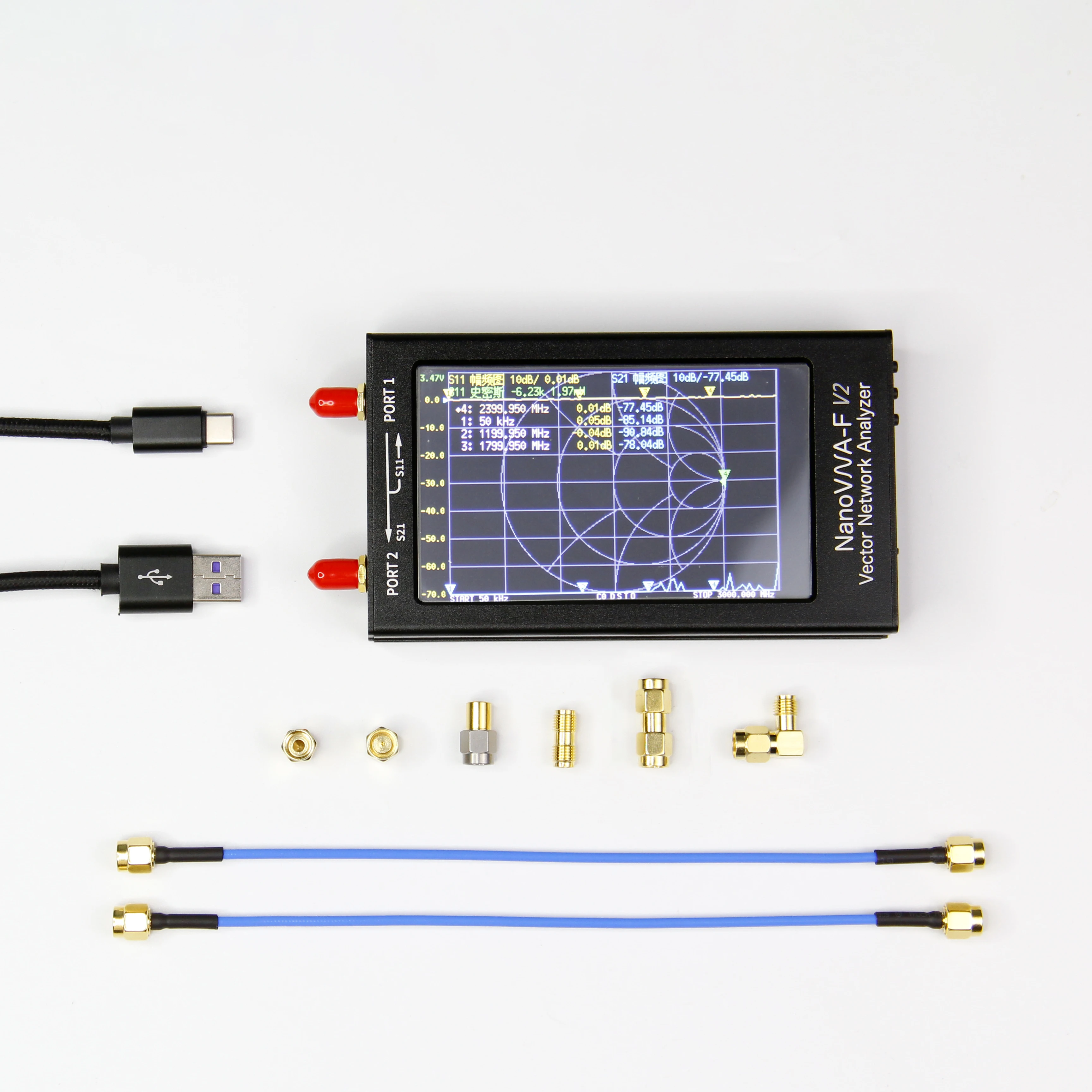 Портативный векторный сетевой анализатор NanoVNA-F V2-это продукт нового поколения, разработанный на базе NanoVNA-F. В нем используется 2,5-дюймовый ЖК-дисплей IPS и чехол из алюминиевого сплава. Он оснащен стандартной литиевой батареей большой емкости 5000 мАч. Срок службы батареи может достигать 7 часов., Поддержка работы сенсорного экрана и боковых кнопок, поддержка интерфейса на китайском и английском языках. Дизайн этого продукта основан на NanoVNA и SAA V2 эди555's, а глубокая оптимизация программного обеспечения производится на основе продукта предыдущего поколения NanoVNA-F. Рабочий интерфейс совместим с NanoVNA-F, диапазон измерения расширен до 3 ГГц, а динамический диапазон больше. Более точное измерение и более удобная эксплуатация.