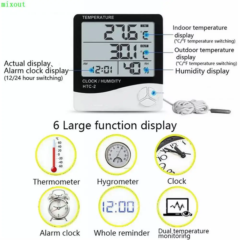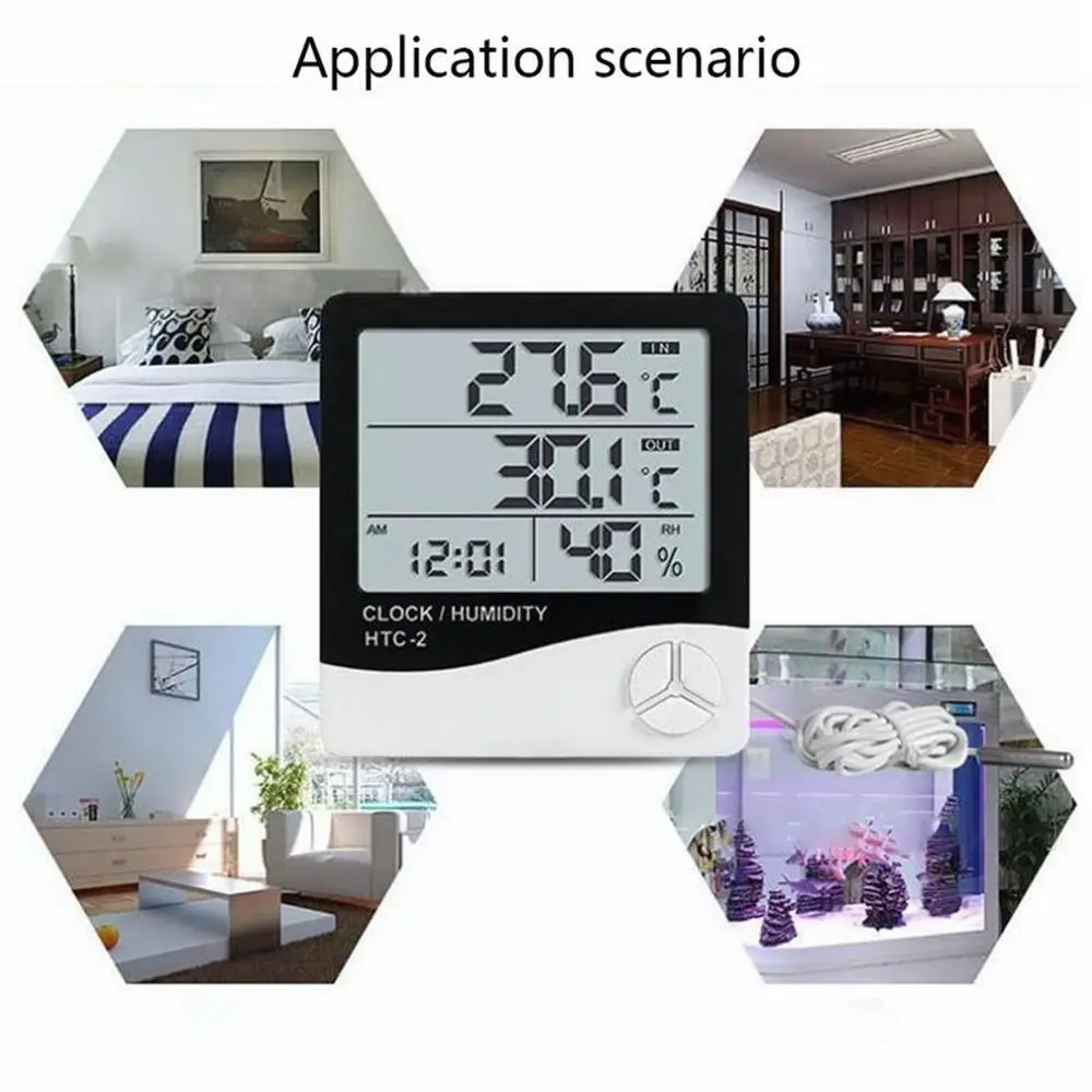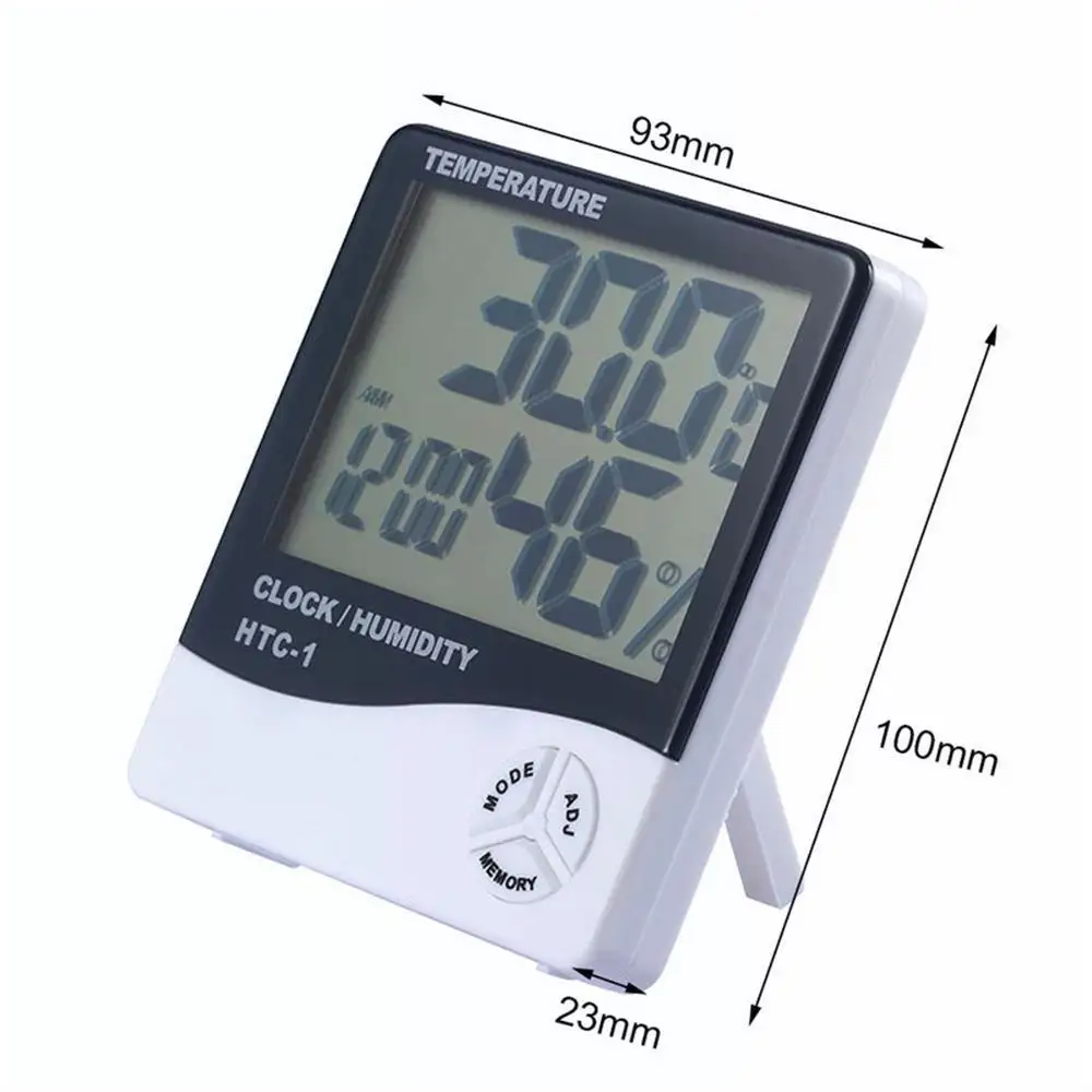 Размер изделия: 102*92*22 мм Материал: АБС-пластик Цвет: белый и черный Диапазон температур: -10 ° ~ + 50 ° Диапазон влажности: 10% ~ 99% RH Температура Разрешение: 0,1 ° (0,2 °) Разрешение влажности: 1% RH Точность измерением температуры: ± 1 ° (1,8 °) Точность измерения влажности: ± 5%(30%-70%) Батарея: 1 * AAA батарея (не входит в комплект) Посылка: 1 * гигрометр с термометром, 1 * Руководство пользователя, 1 * кабель Особенности: 1. Функция: измерение влажности, температуры и времени одновременно, большой ЖК-дисплей, легко читается. 2. Функция 2: память Макс/Мин измерения значение, 12-часовой/24-часовая система показа на выбор. 3. Выбор единицы: блок температуры переключается, между ° и ° единицы выбираются. 4. Портативный: функция будильника, компактный и легкий, легко носить с собой. 5. Использование: широко используется для измерения температуры и влажности в помещении, подходит для лаборатории, транспортировки холодных цепей, складирования и многого другого. 6. Большой ЖК-дисплей: ЖК-экран с большими цифрами Отображает текущее значение температуры внутри помещения и влажности, легко и ясно читается. 7. Легко установить: с выдвижной подставкой, просто помещается на стол.