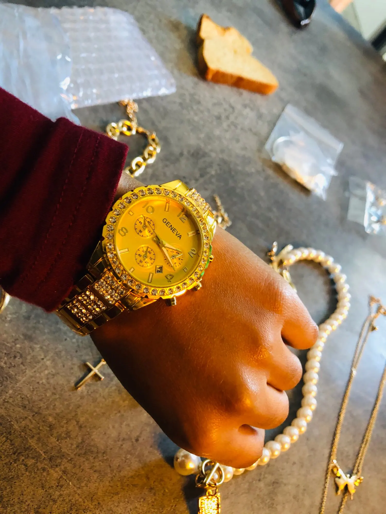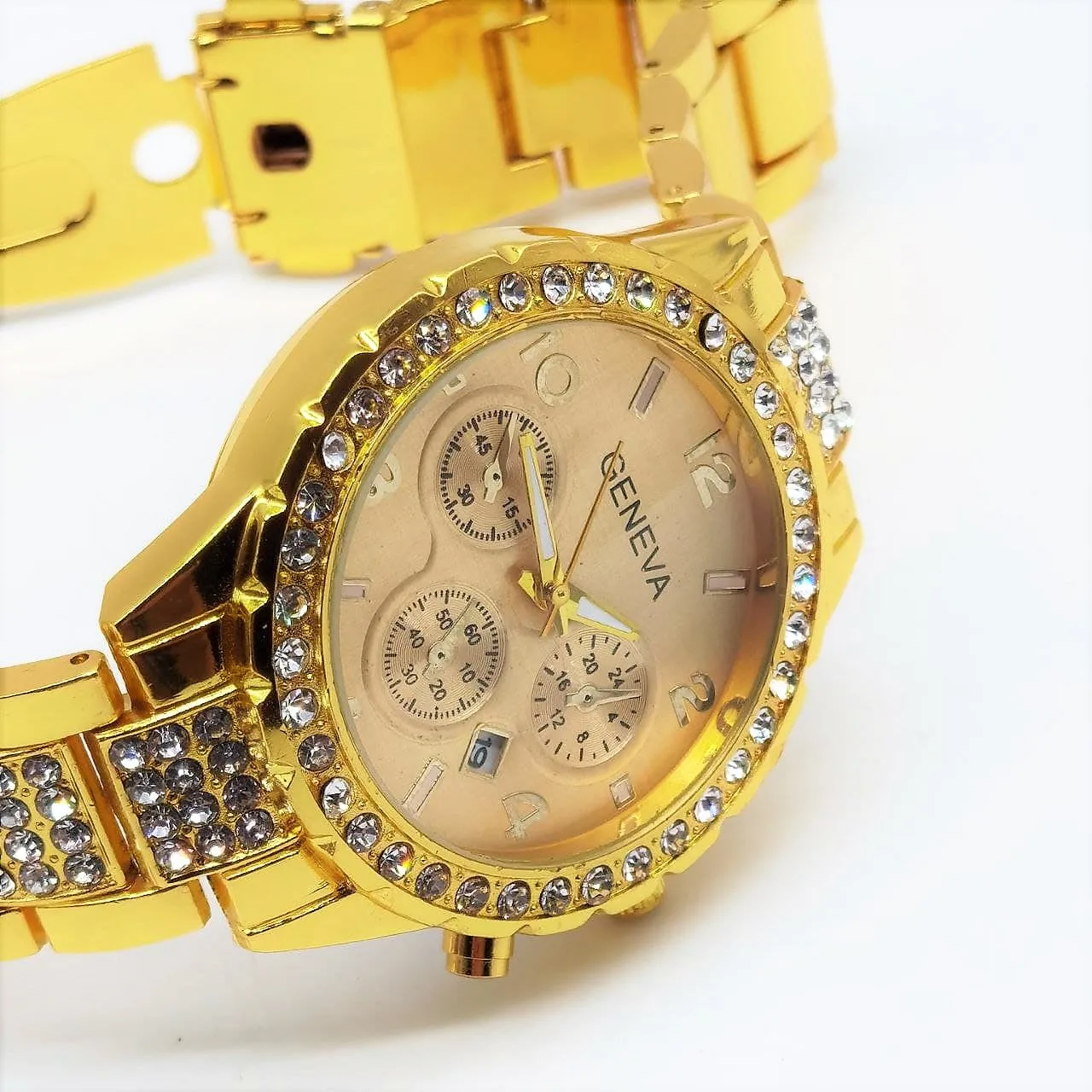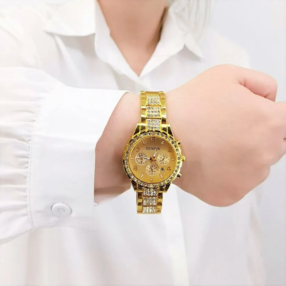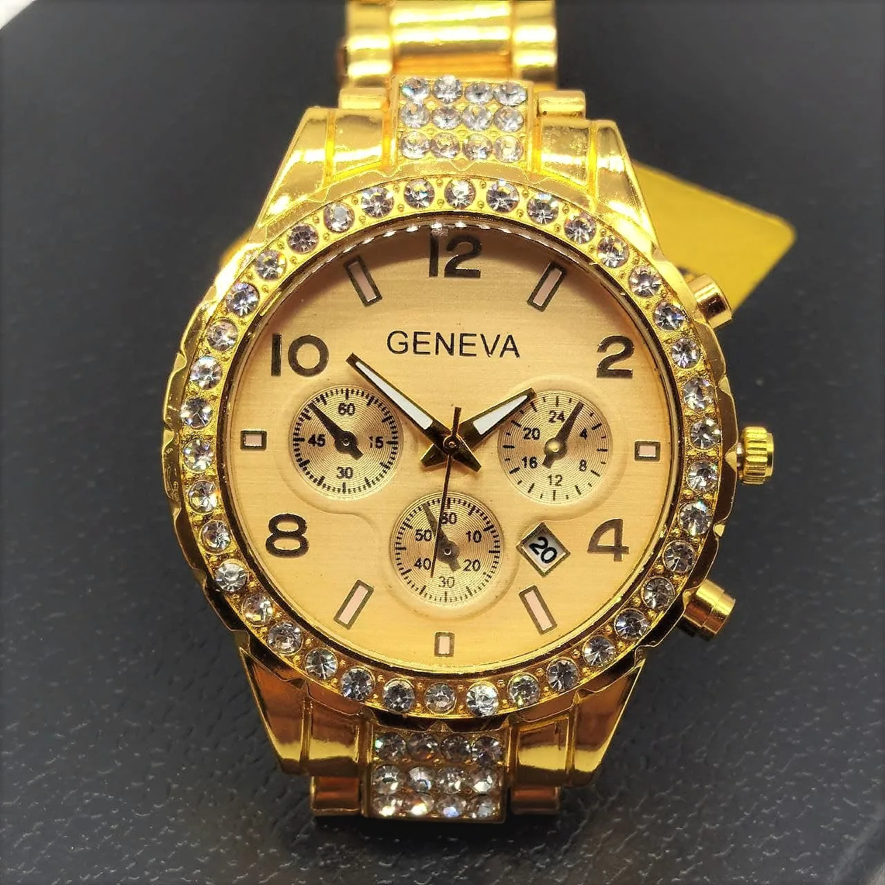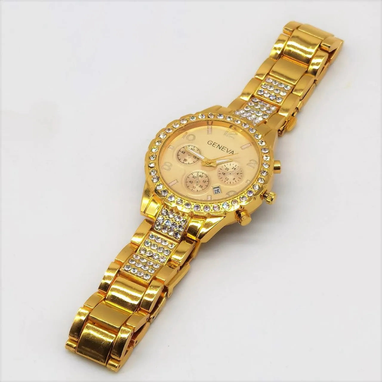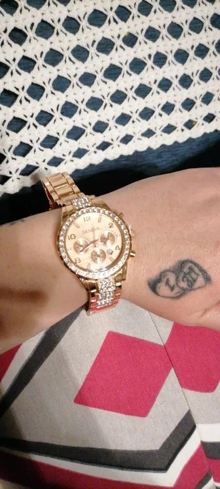 Очень стильные и изысканные часы. Смотрятся солидно и дорого! Элегантные изгибы корпуса и браслета из нержавеющей стали с полированной золотой поверхностью эффектно подчёркивают блеск инкрустации безеля с качественными стразами из горного хрусталя , красивой ювелирной огранки . При попадании на них света они сверкают , как настоящие бриллианты. Выглядит это очень красиво! Стекло немного выпуклое , что придает циферблату объём. В часах стрелки светятся в темноте. Есть окошко с датой. Внутри часов есть красивый хронограф , но он выполняет чисто декоративную функцию . Браслет очень красивый , украшенный от начала корпуса стразами. Мне часы понравились! К покупке рекомендую!