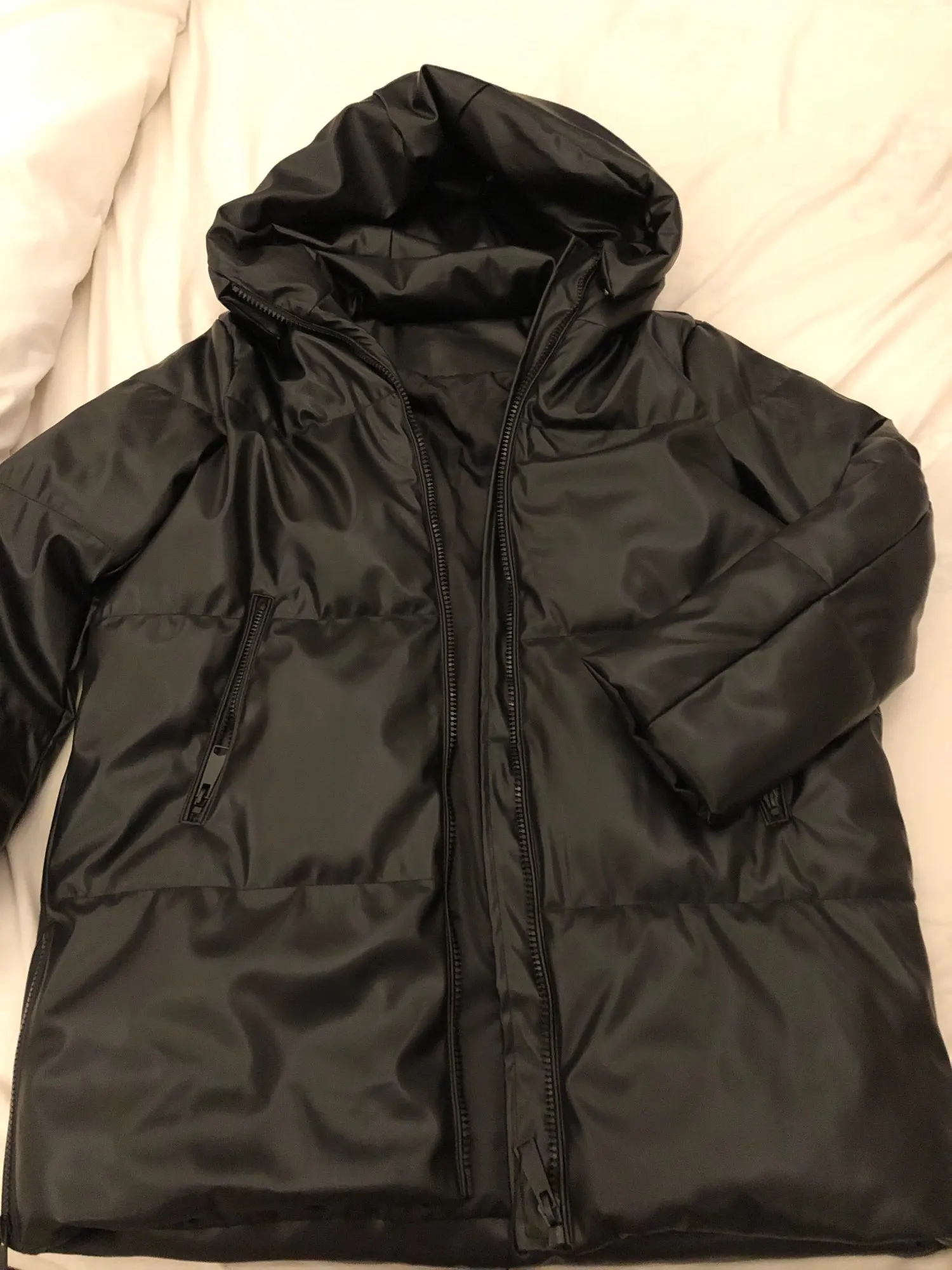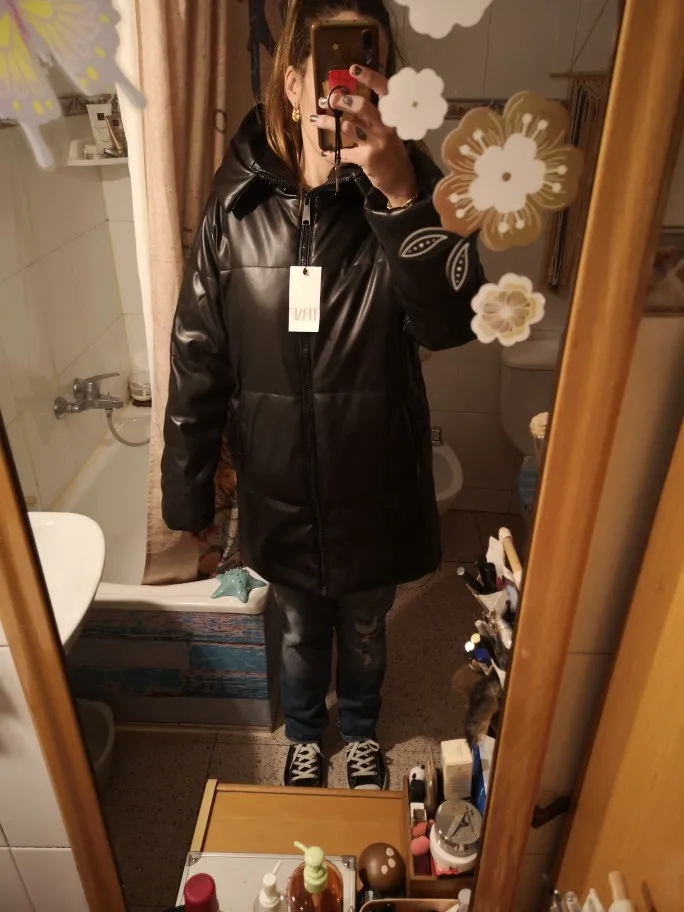 Доставка мега-быстрая, несмотря на новогодние праздники (~7дней). Забирала из пункта выдачи на кассе 5ки. К качеству и пошиву претензий нет - куртка не хуже, чем аналогичная в ZARA (8999₽ в магазине), только кожзам более тонкий и мягкий. На российский р-р 40-42 (~90/63/93) заказывала XS. Не сказать, что я в нем утонула, но стоит достаточно свободно, чтобы пододеть все, что угодно: от водолазки до толстовки. Своих денег однозначно стоит, буду носить!