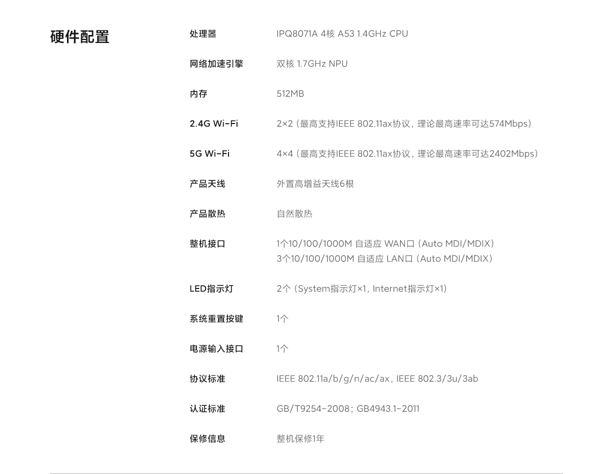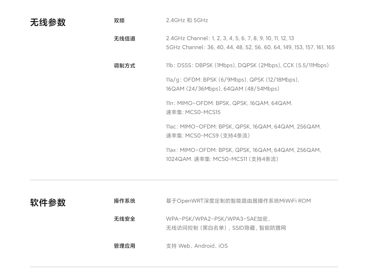 Xiaomi Redmi Router AX6 Wifi 6 6-ядерный 512M Memory Mesh Home IoT 6 усилитель сигнала 2,4G 5GHz Аппаратная конфигурация Процессор 4-ядерный процессор IPQ8071A A53 1,4 ГГц Двигатель сетевого ускорения Двухъядерный 1.7ггц NPU ПЗУ: Не записано Память: 512 Мб 2,4 ГГц WiFi: 2x2 (максимальная поддержка протокола IEEE 802.11ax, теоретическая максимальная скорость до 574 Мбит/с) 5 ГГц WiFi: 4x4 (максимальная поддержка протокола IEEE 802.11ax, теоретическая максимальная скорость может достигать 2402 Мбит/с) Антенна продукта: 6 всенаправленных антенн с высоким коэффициентом усиления Охлаждение продукта: Естественное охлаждение Интерфейс машины: 1 10/100 / 1000M адаптивный порт WAN (Auto MDIMDIX) 3 10/100 / 1000M адаптивные LAN порты (Auto MDIMDIX) Светодиодный индикатор: 2 (системный индикатор * 1, Интернет-индикатор * 1) Кнопка сброса системы: 1 Интерфейс ввода питания: 1 Стандарты протокола: IEEE 802.11a / b / g / n / ac / ax, IEEE 802,3/3u / 3ab Стандарт сертификации: GB / T9254-: 2008; GB4943.1-2011 Беспроводные параметры Двойная частота: 2,4 ГГц и 5 ГГц Беспроводной канал: 2,4 ГГц канал: 1,2,3,4,5,6,7,8,9,10,11,12,13 5 ГГц канал: 36,40,44,48,52,56,60,64,149153157161165 Модуляция: 11b: DSSS: DBPSK (1 Мбит/с), DQPSK (2 Мбит/с), CCK (5,5/11 Мбит/с) 11a / g: OFDM: BPSK (6 / 9 Мбит/с), QPSK (12/18 Мбит/с), 16QAM (24/36 Мбит/с), 64QAM (48/54 Мбит/с) 11n: MIMO-OFDM: BPSK, QPSK, 16QAM, 64QAM. Набор ставок: MCS0 ~ MCS15 11ac: MIMO-OFDM: BPSK, QPSK, 16QAM, 64QAM, 256QAM. Набор скорости: MCS0 ~ MCS9 (поддержка 4 потоков) 11ax: MIMO-OFDM: BPSK, QPSK, 16QAM, 64QAM, 256QAM, 1024QAM. Набор скорости: MCS0 ~ MCS11 (поддержка 4 потоков) Параметры программного обеспечения Операционная система: Умная WiFi операционная система на основе OpenWRT глубоко настроенная MiWiFi ROM Беспроводная безопасность: WPA-PSKWPA2-PSKWPA3-SAE шифрование, беспроводное управление доступом (черный и белый список), скрытие SSID, интеллектуальная сеть против трения Применение управления: Поддержка веб, Android. Ios Характеристики продукта: Руководство (включая три упаковки карт) * 1 Источник питания продукта * 1 Рабочая среда Рабочая температура окружающей среды: 0 ~ 40 ℃ Рабочая влажность: 10% ~ 90% относительной влажности (без конденсации) Температура хранения: -4 -70 ℃ Влажность хранения: 5% ~ 90% относительной влажности (без конденсации)